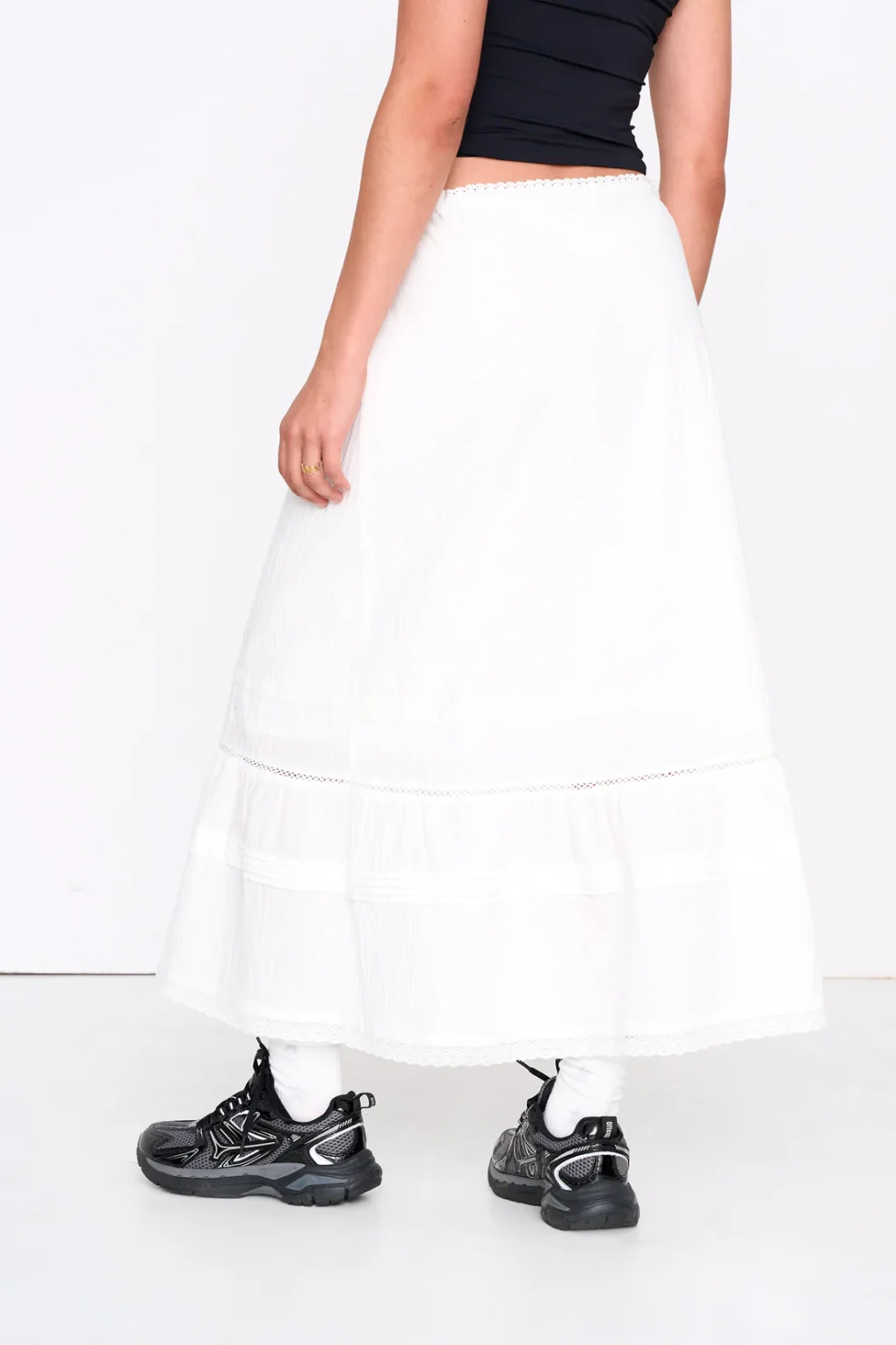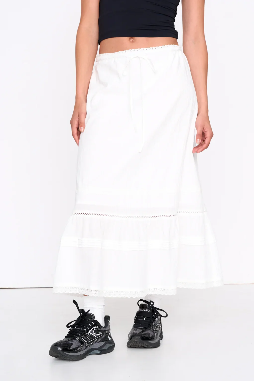 Αέρινη και κομψή, αυτή η A-line φούστα της 24COLOURS σε λευκό χρώμα είναι ιδανική για ρομαντικά και καλοκαιρινά looks. Ο πολυεπίπεδος σχεδιασμός της χαρίζει όμορφη κίνηση, ενώ οι διακριτικές λεπτομέρειες δαντέλας προσθέτουν μια θηλυκή και κομψή πινελιά. Διαθέτει δέσιμο με κορδόνι στη μέση για άνετη και ρυθμιζόμενη εφαρμογή. Κατασκευασμένη από 100% βαμβάκι, προσφέρει φυσική αίσθηση και άνεση καθ’ όλη τη διάρκεια της ημέρας.