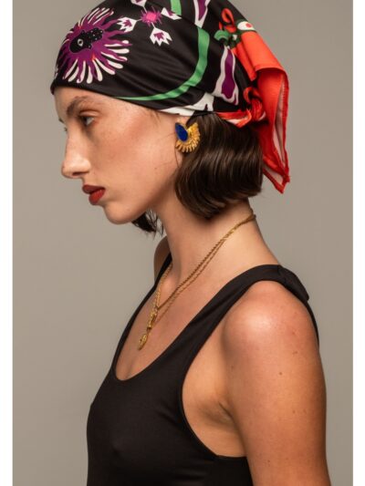 Σκοτεινή κομψότητα, ευαίσθητα λουλούδια και αφηρημένα στοιχεία συνδυάζονται αρμονικά σε μια καλλιτεχνική σύνθεση με αποχρώσεις του πορτοκαλί, βαθύ πράσινου και βιολετί, πάνω σε μαύρο φόντο. Το Kindred Scarf εμπνέεται από παραδοσιακά σύμβολα και εξωτικά μοτίβα της ζούγκλας, με μαλακές οργανικές γραμμές και έντονο πορτοκαλί περίγραμμα που τονίζει τον δυναμισμό του σχεδίου.