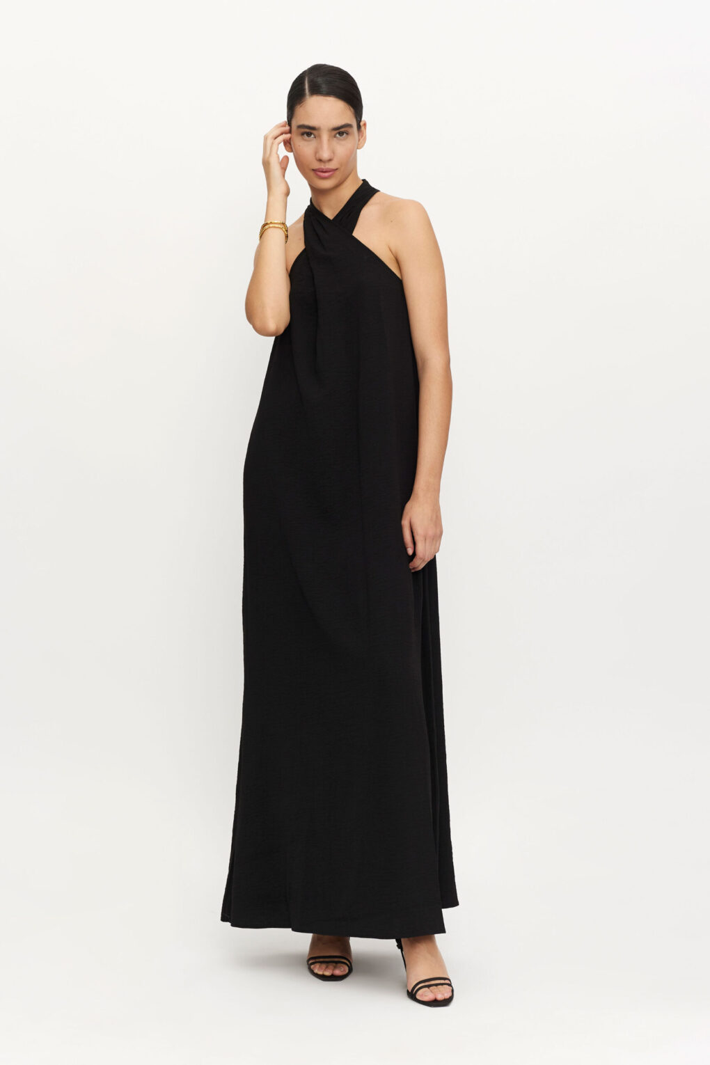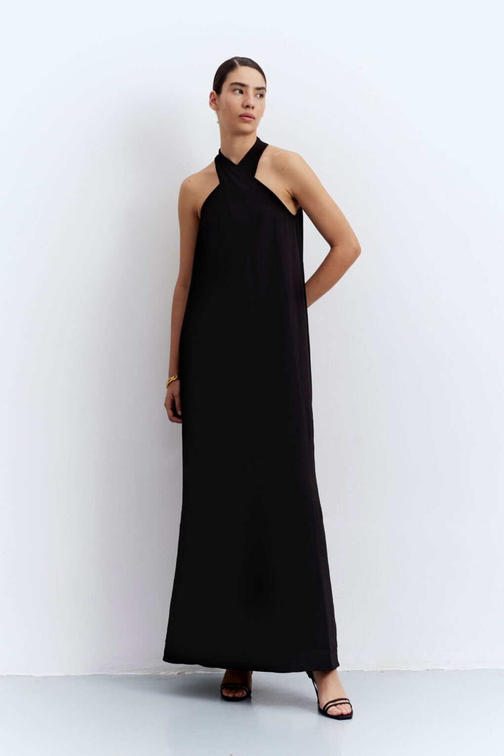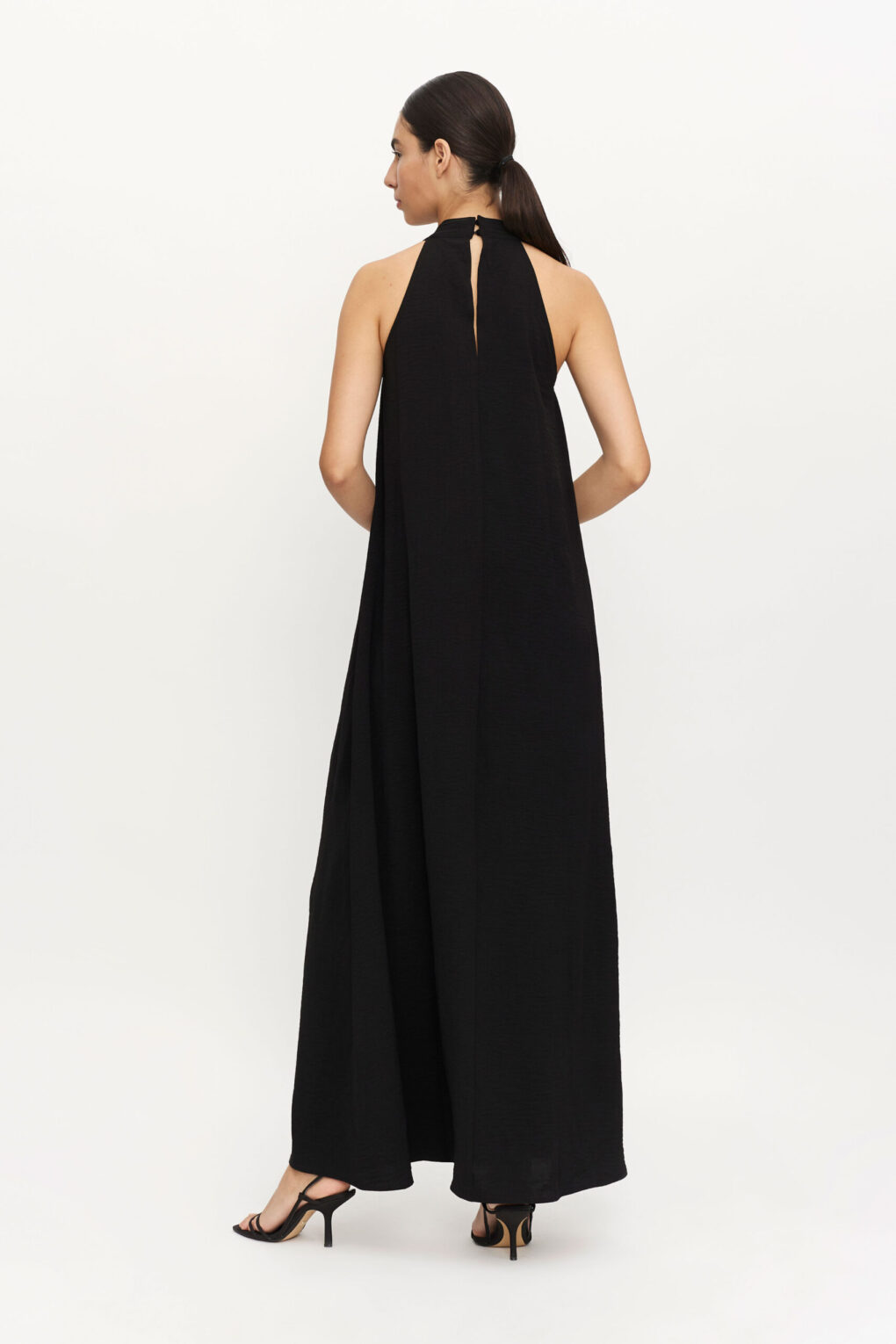 Το Compania Fantasitca Long Black Dress είναι μια εξαιρετική επιλογή για κάθε γυναίκα που αναζητά ένα κομψό και διαχρονικό στυλ. Κατασκευασμένο από ύφασμα κρεπέ, προσφέρει μια μοναδική αίσθηση απαλότητας και άνεσης. Ο λαιμός halter με τις πλατιές τιράντες που διασταυρώνονται προσθέτει μια δόση κομψότητας και θηλυκότητας. Ενώ η έλλειψη μανικιών επιτρέπει την απόλυτη ελευθερία κινήσεων.