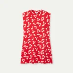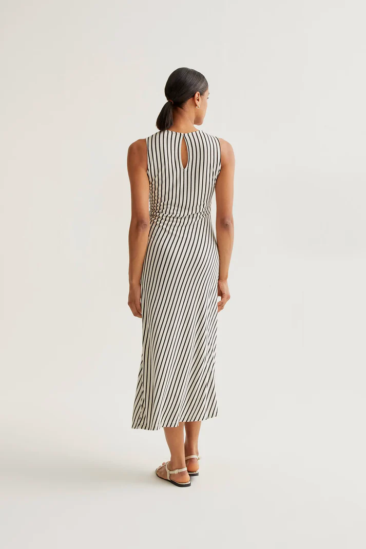 Μακρύ φόρεμα από ύφασμα βισκόζης τύπου jersey με μαύρο ριγέ τύπωμα. Διαθέτει στρογγυλή λαιμόκοψη, χωρίς μανίκια, και ελαστική λεπτομέρεια στη μέση για άνετη εφαρμογή. Χαλαρή γραμμή.
