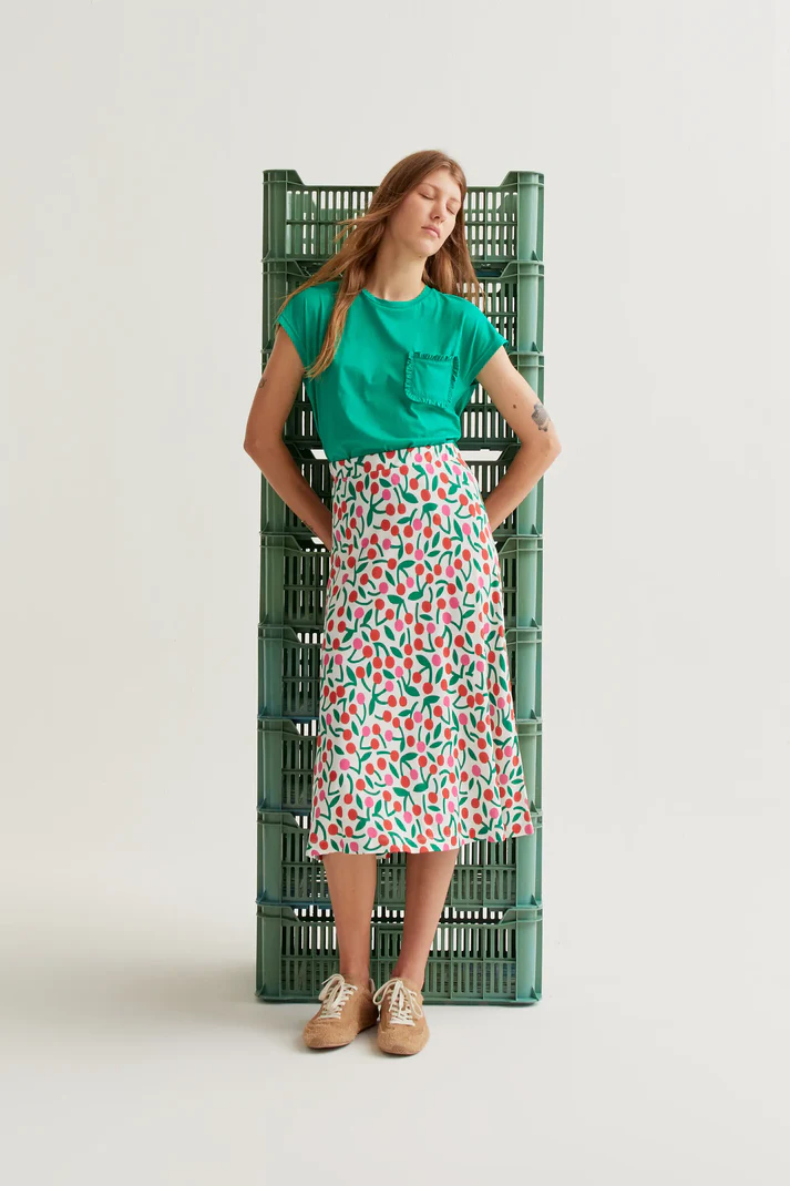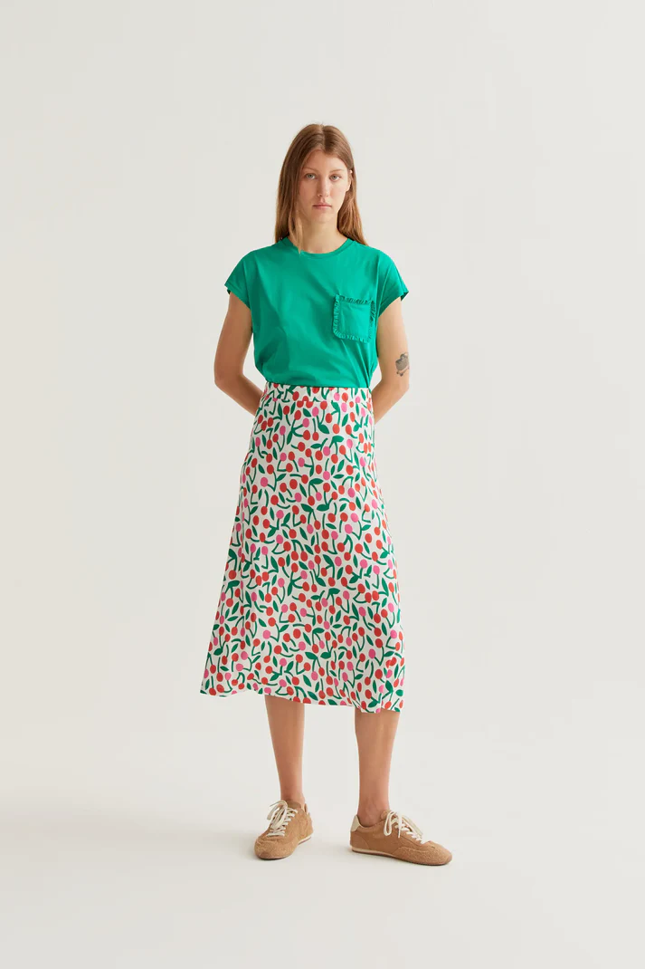 Midi φούστα από ύφασμα βισκόζης τύπου jersey με τύπωμα κερασιών. Διαθέτει ψηλή, σταθερή μέση και ροή cut για άνετη εφαρμογή. Φοράει φόδρα.