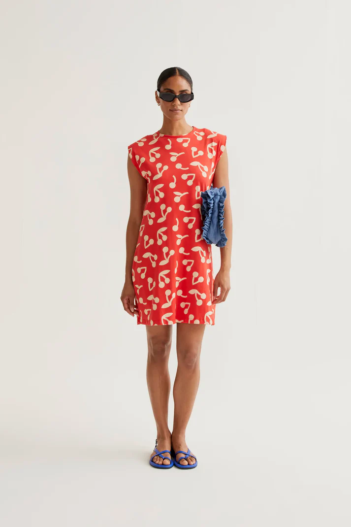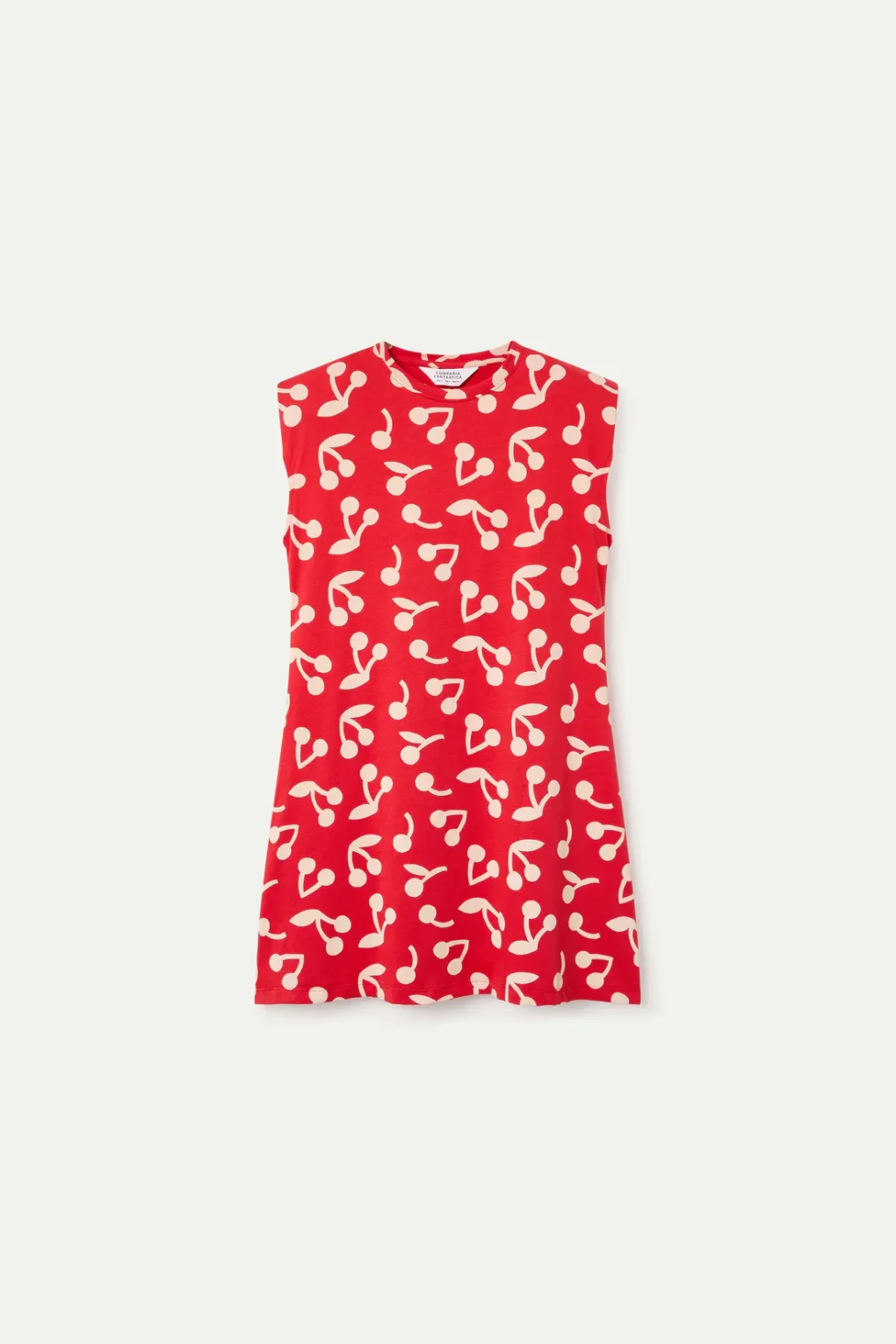 Κοντό φόρεμα από 100% βαμβάκι με τύπωμα κόκκινο κεράσι. Διαθέτει στρογγυλή λαιμόκοψη, χωρίς μανίκια και ροή cut για άνετη εφαρμογή.