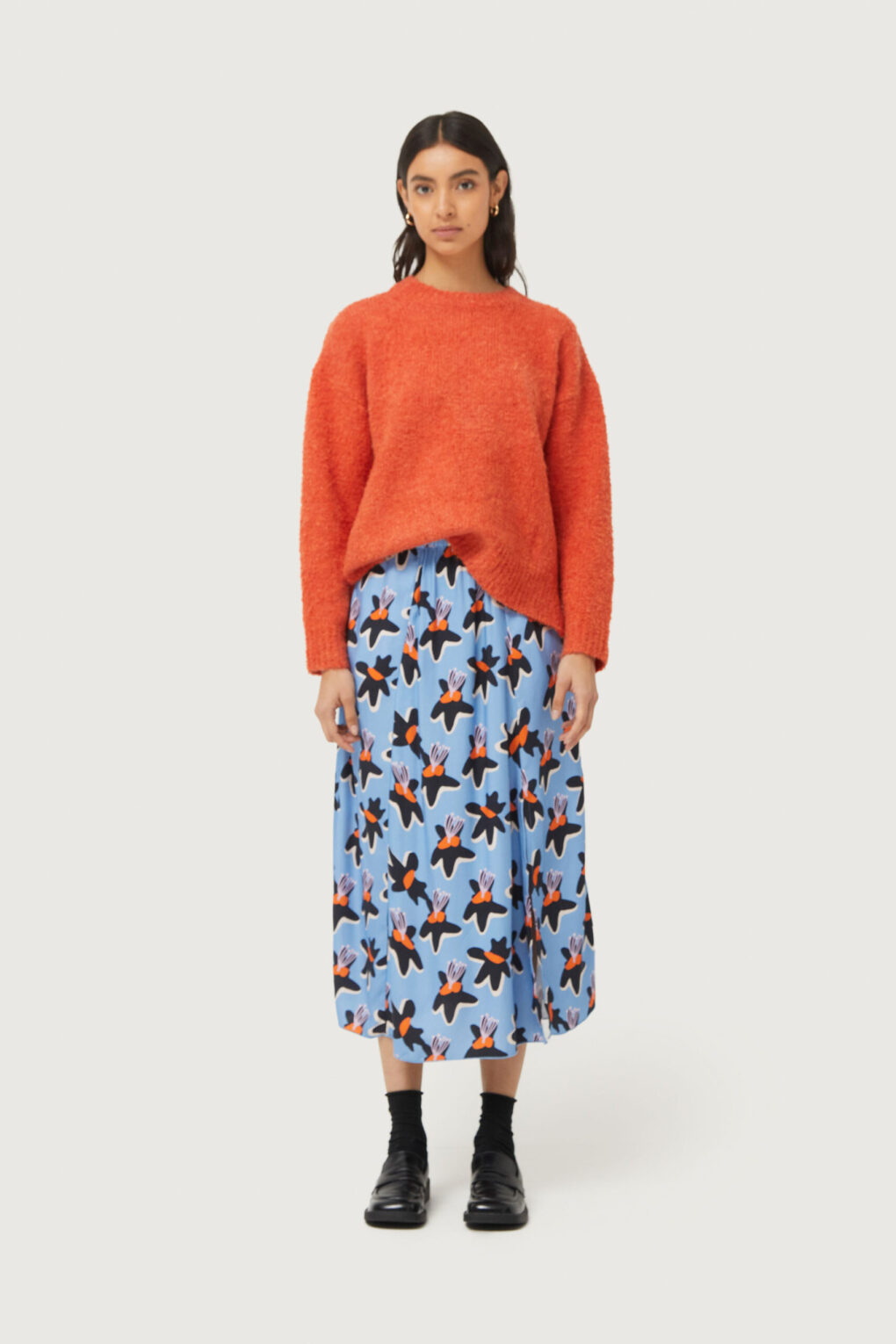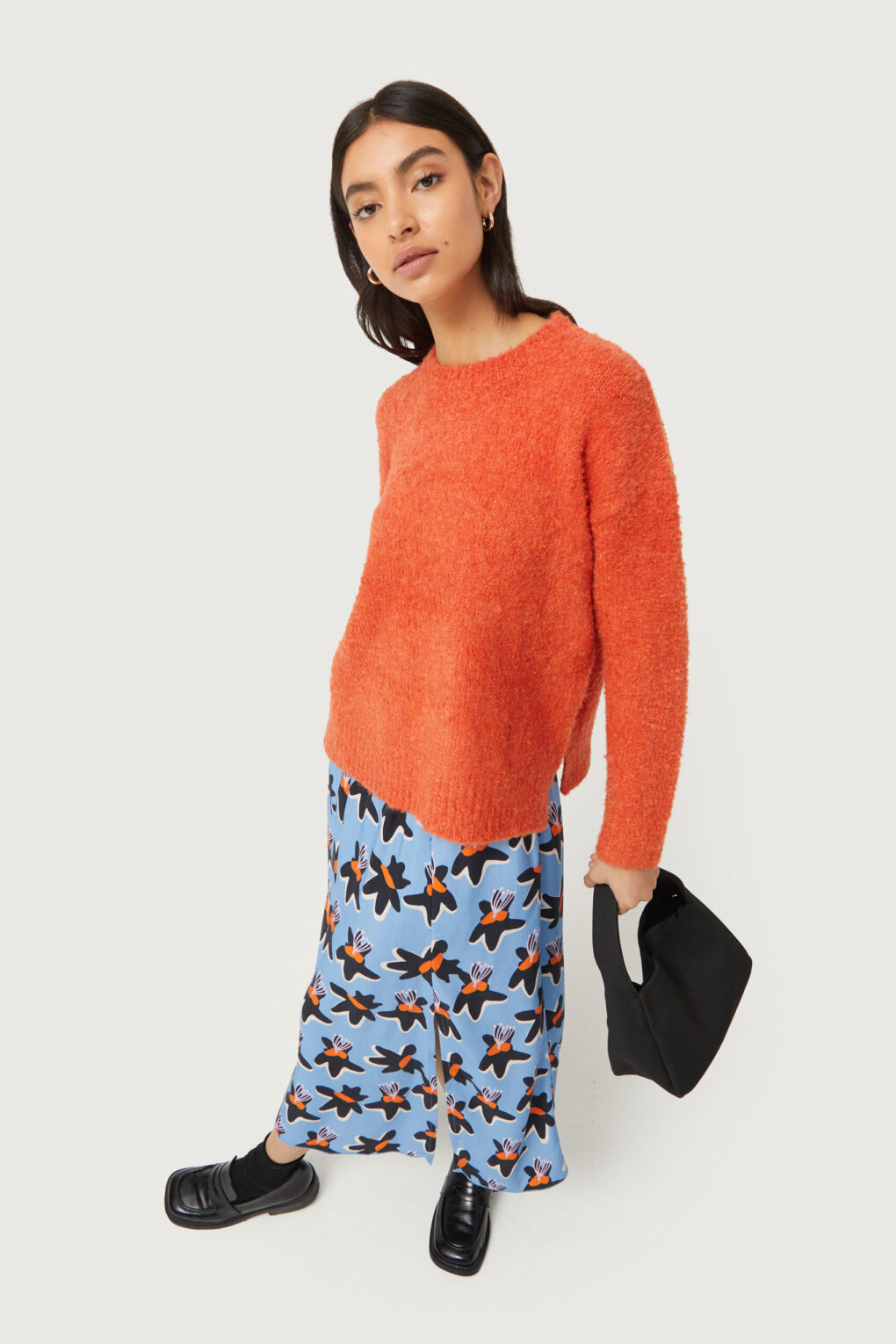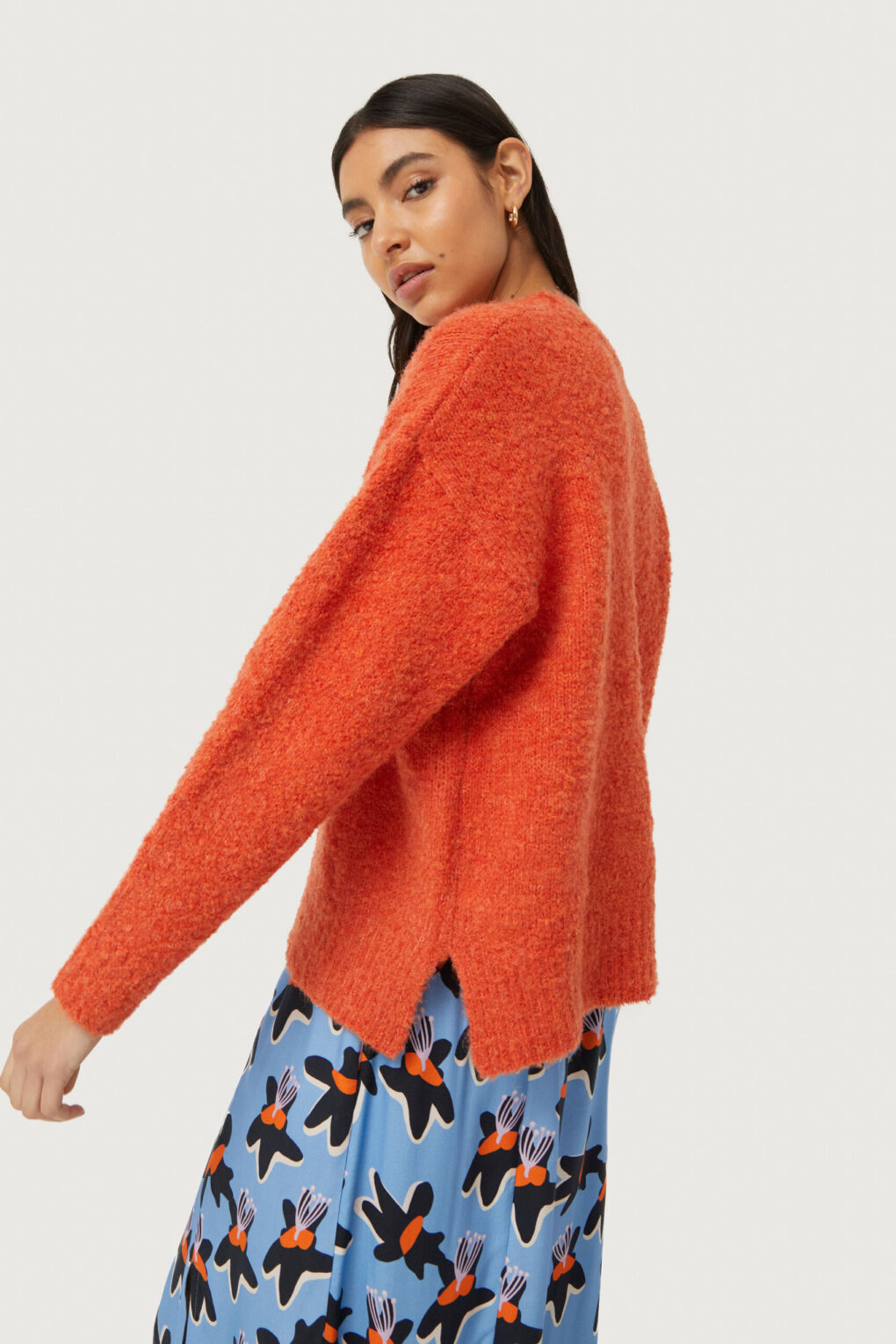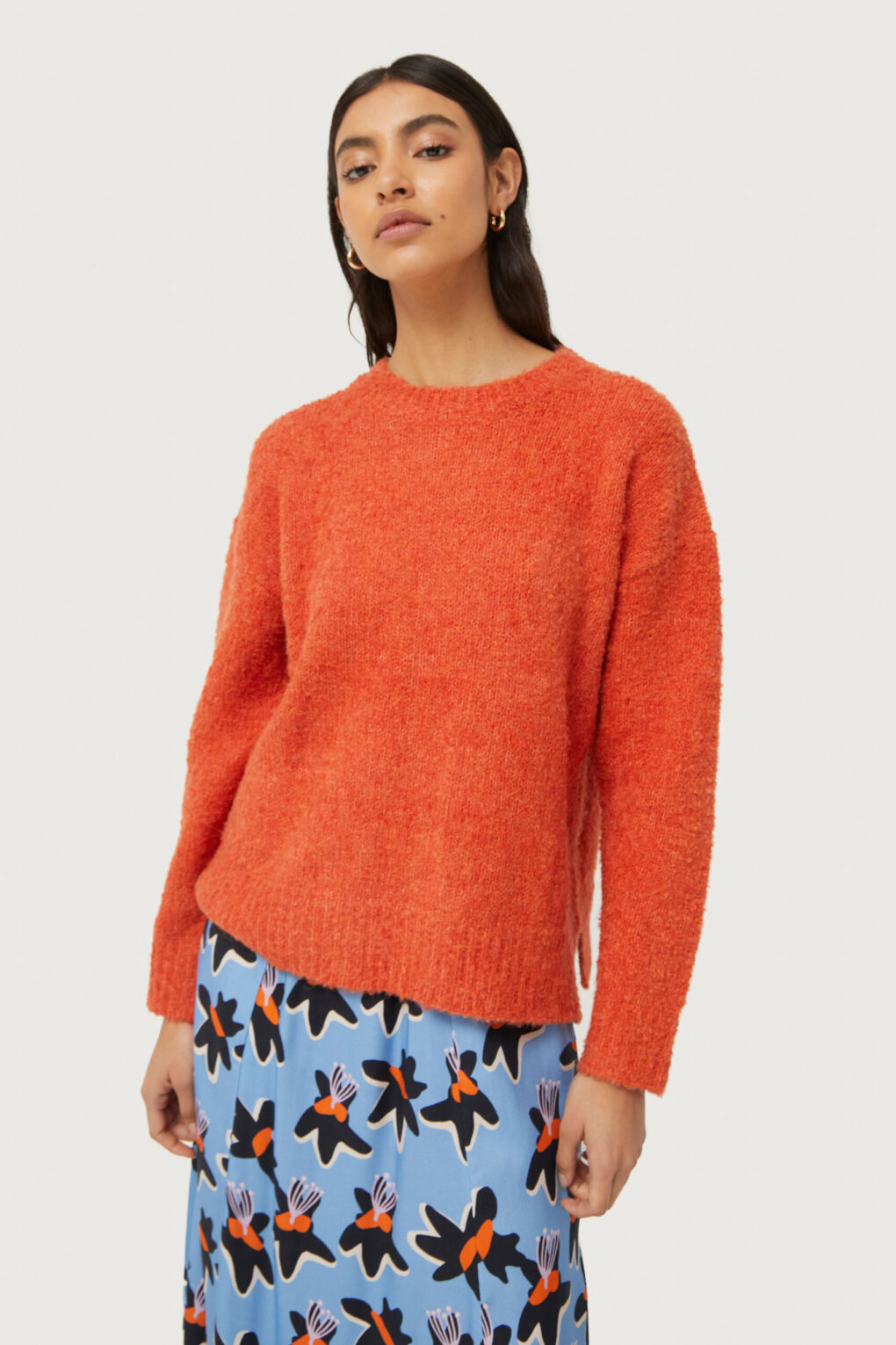 Το Compania Fantastica Fluffy Knit Sweater είναι ένα πορτοκαλί αφράτο πλεκτό πουλόβερ με στρογγυλή λαιμόκοψη και μακριά μανίκια. Ιδανικό για να προσφέρει άνεση και στυλ τις πιο κρύες ημέρες.