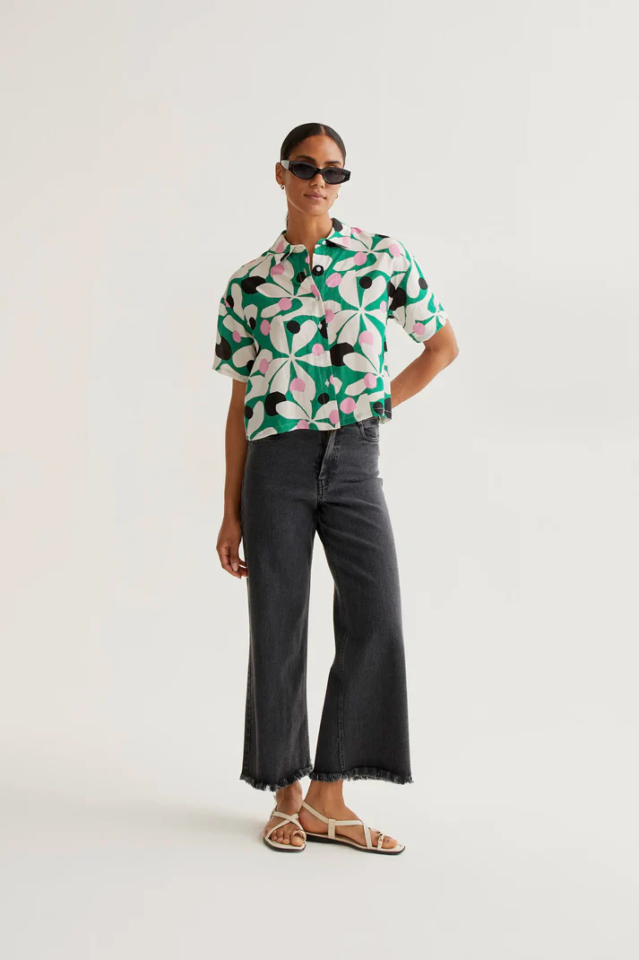 Ελαφρύ πουκάμισο από κρεπ ύφασμα με τύπωμα hosta. Διαθέτει γιακά με πέτο και κοντά μανίκια, ενώ οι ελαφρώς χαμηλωμένοι ώμοι προσφέρουν άνετη εφαρμογή. Κλείνει μπροστά με λευκά κουμπιά.