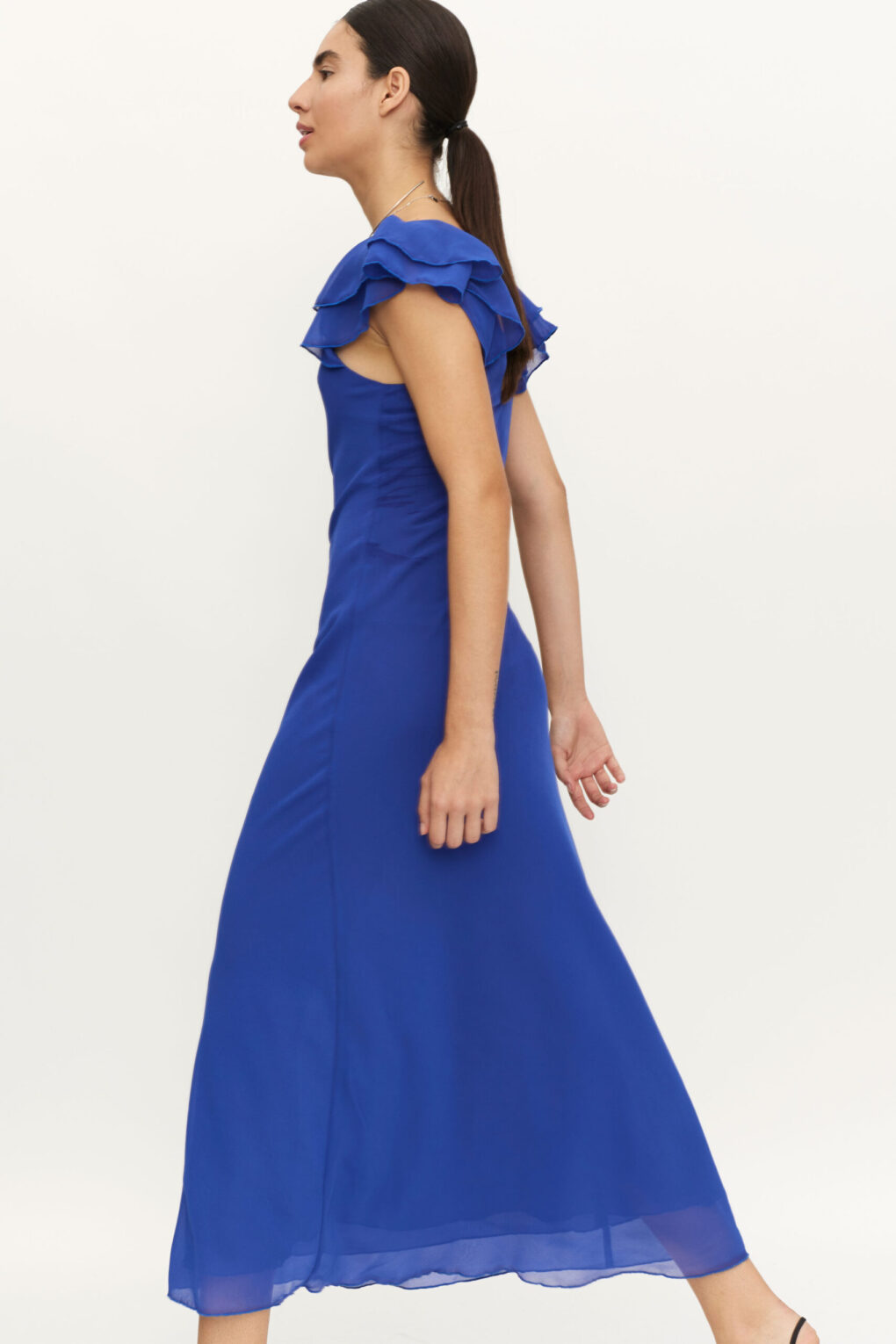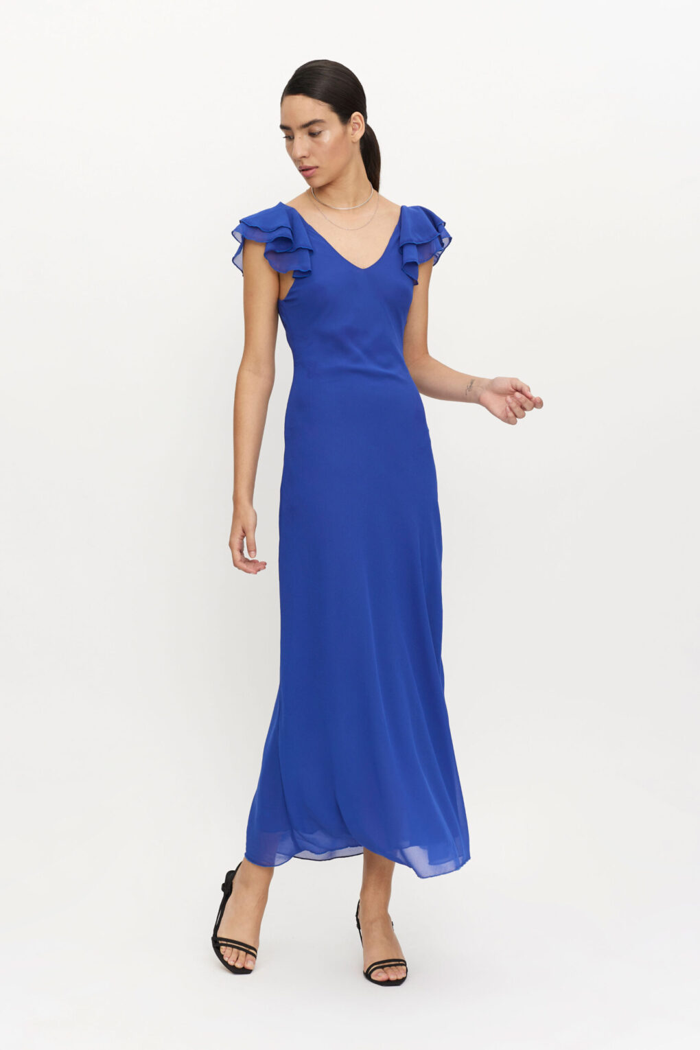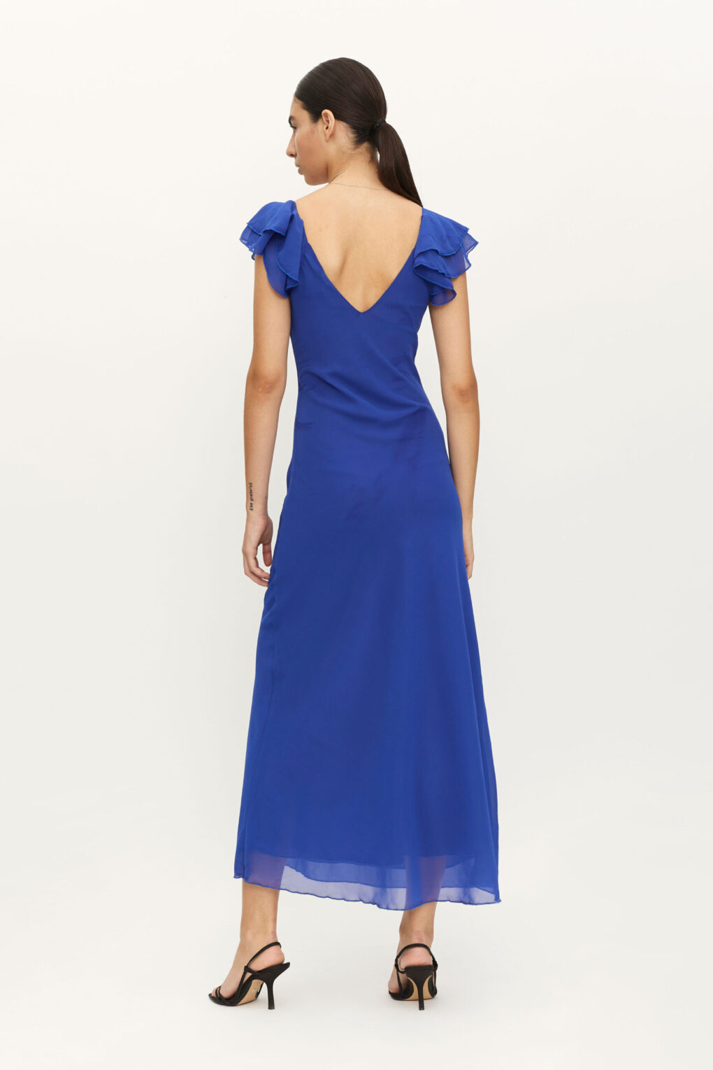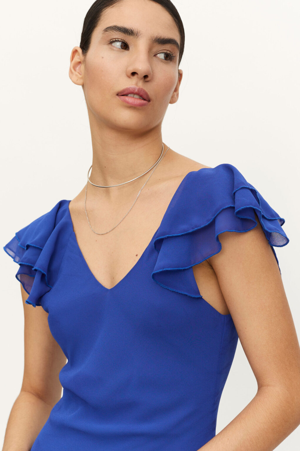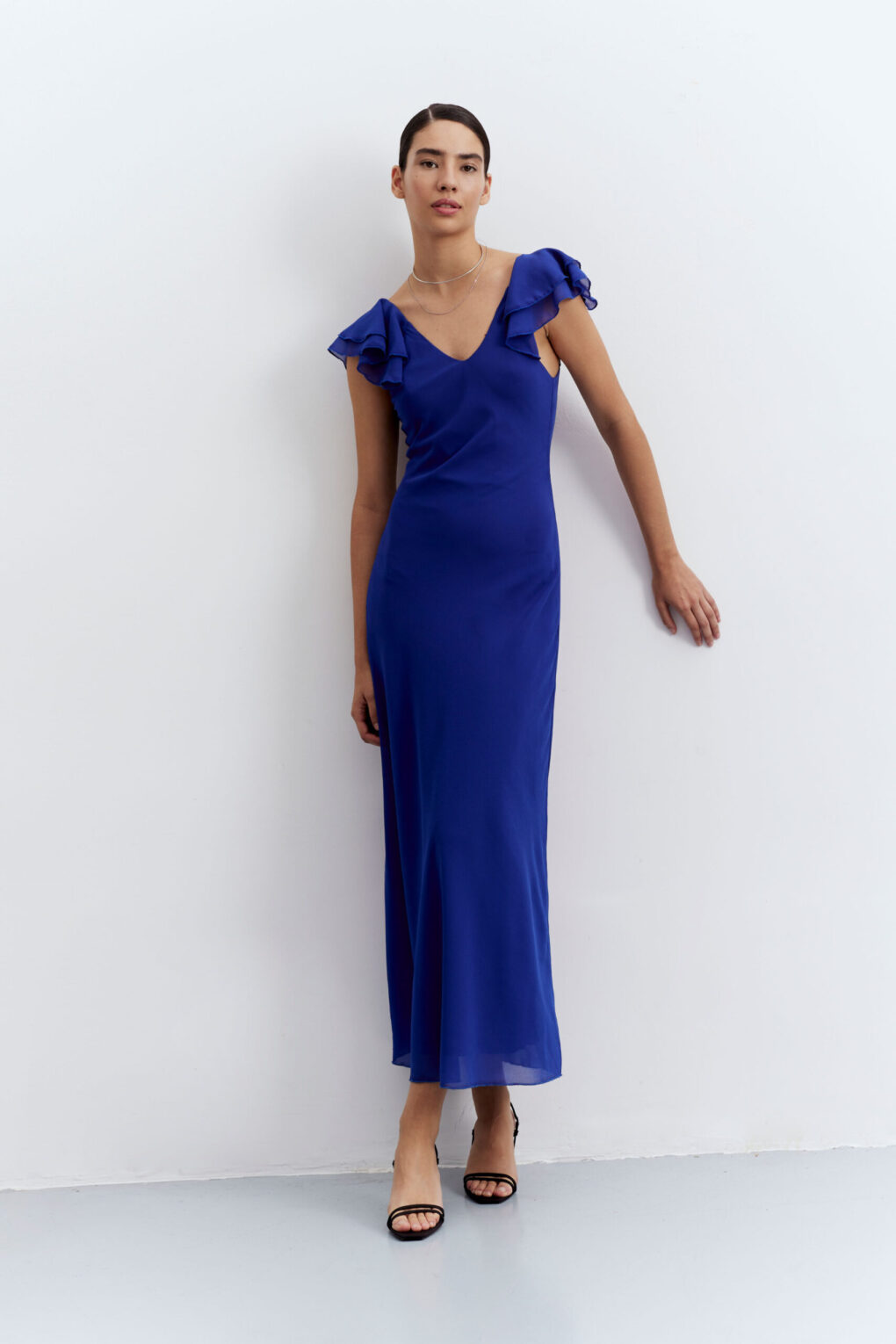 Η λαιμόκοψη σε σχήμα V δημιουργεί μια κολακευτική γραμμή και αναδεικνύει τον λαιμό και τους ώμους. Τα μανίκια διαθέτουν λεπτές σούρες στους ώμους, έτσι δίνουν μια διακριτική νότα ρομαντισμού και κίνησης καθώς η γυναίκα κινείται. Το φόρεμα έχει στενή εφαρμογή στο σώμα, το οποίο το αναδεικνύει με διακριτικότητα, ενώ η χαμηλή πλάτη προσθέτει μια αισθησιακή πινελιά και κεντρίζει τα βλέμματα.