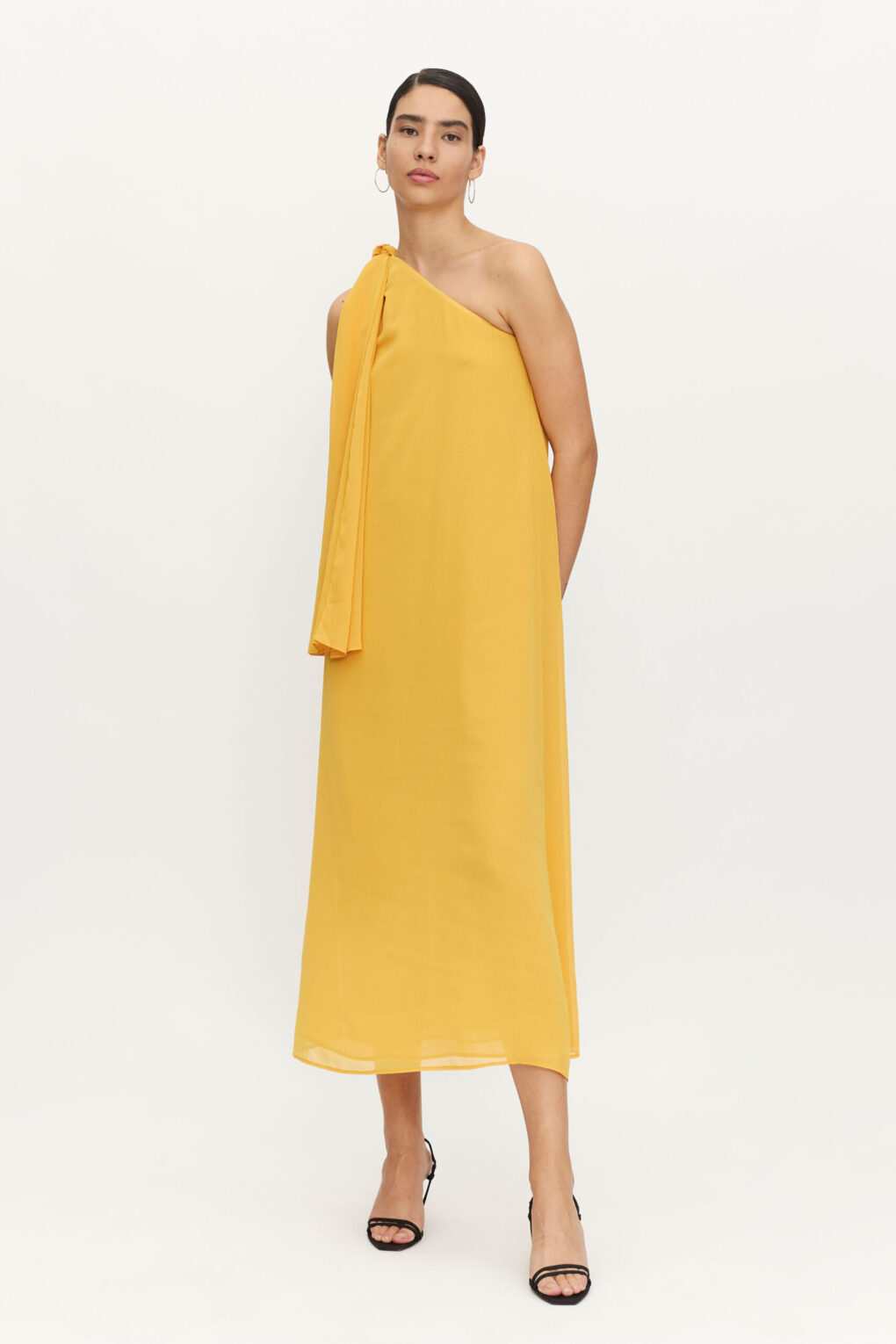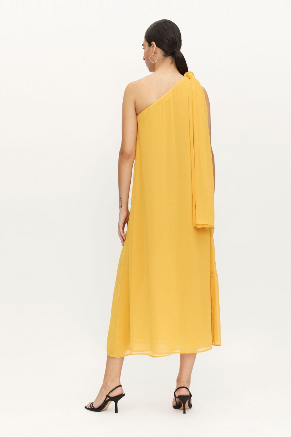 Το Compania Fantastica Long Yellow Dress από ύφασμα chiffon αναδύει μια αίσθηση ελαφρότητας και κομψότητας. Η ασύμμετρη μανίκια σχεδίαση αφαιρεί τα κλασικά χαρακτηριστικά του φορέματος, προσφέροντας ένα μοντέρνο στυλ. Η απαλή γραμμή του προσφέρει ελευθερία κινήσεων και αναδεικνύει την θηλυκότητα. Ένα μικρό άνοιγμα στο πλάι προσθέτει μια δόση διακριτικής ερεθιστικότητας στο σχέδιο.