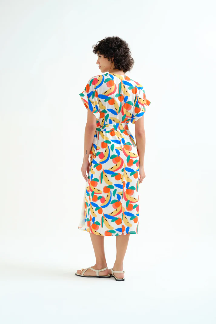 Ανάλαφρο και θηλυκό, αυτό το φόρεμα από viscose ύφασμα με μικρό tutti frutti print είναι ιδανικό για καλοκαιρινές εμφανίσεις. Η V λαιμόκοψη και τα κοντά μανίκια προσφέρουν άνεση και κομψότητα, ενώ η λεπτομέρεια δεσίματος στη μέση αναδεικνύει τη σιλουέτα με φυσικό τρόπο. Ένα ευκολοφόρετο κομμάτι που συνδυάζει άνεση και παιχνιδιάρικο στυλ.