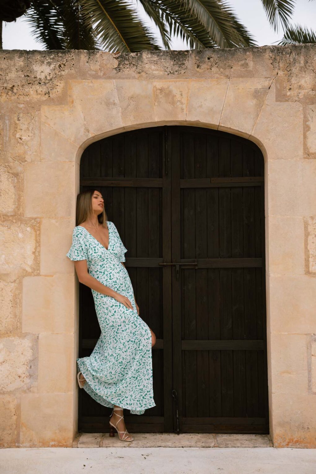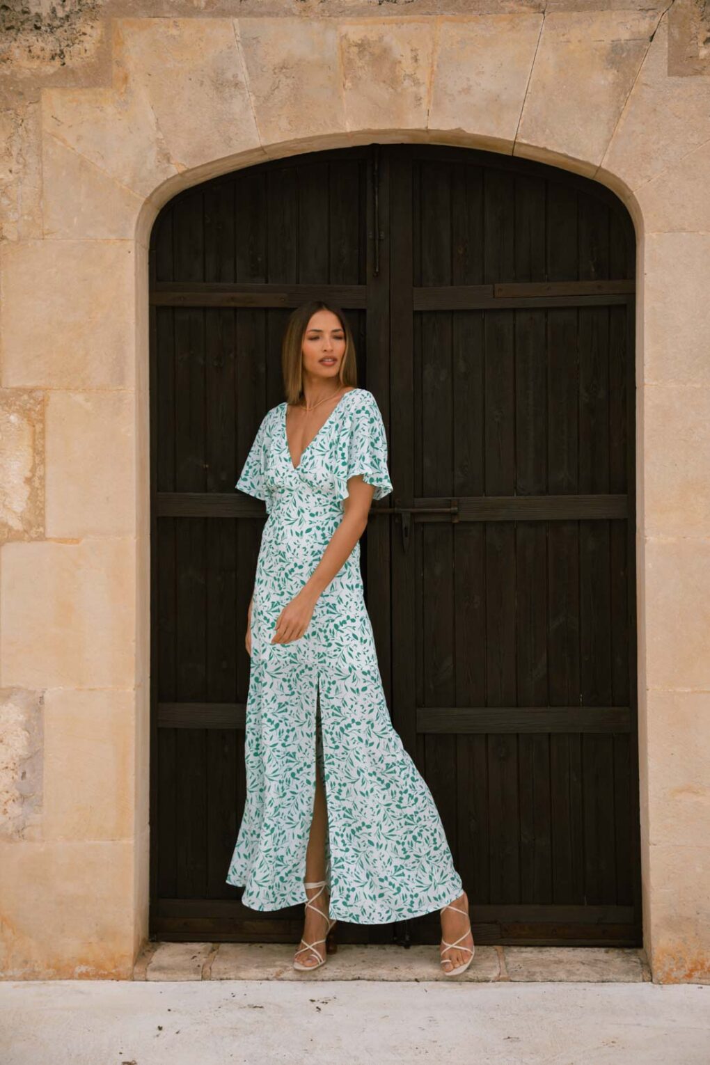 The perfect dress of the summer. This fab maxi is made from a light and breathable fabric perfect for warmer days. Featuring a fitted bodice with a flared skirt and a some elastic to the waist for a comfortable fit. Complete with a v-neck, v-back a skirt split and floaty angel sleeves. Zip it up at the back. Team it with a pair of heels or wedges to complete the look.