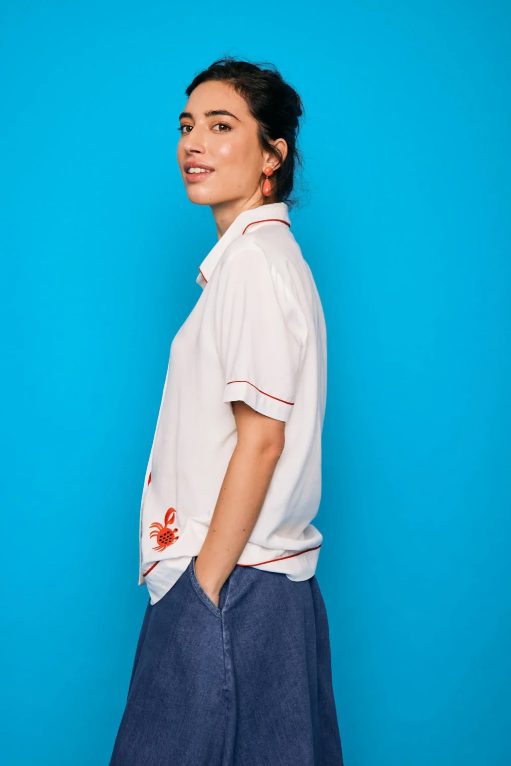 Το γυναικείο πουκάμισο Javea είναι λευκό, με λεπτομερή κεντήματα που απεικονίζουν ένα “carramarro” – ένα στοιχείο με ιδιαίτερη σημασία για τη δημιουργό. Το κόψιμο θυμίζει τη χαρακτηριστική κουβανέζικη guayabera, με χαλαρή, άνετη εφαρμογή και ξεχωριστό στυλ.