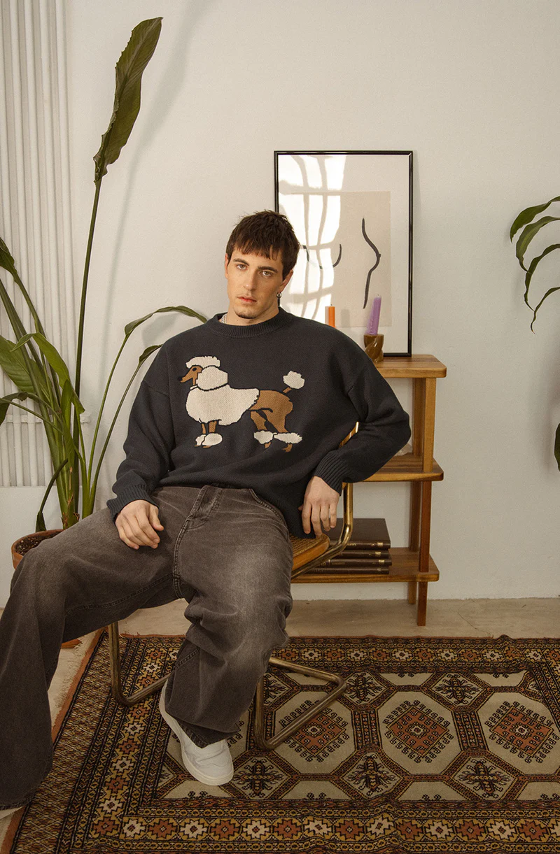 Το πλεκτό σχέδιο με Poodle στο μπροστινό μέρος προσθέτει vintage έμπνευση και παιχνιδιάρικη διάθεση, ενώ η χαλαρή γραμμή και τα rib τελειώματα σε λαιμό, μανσέτες και στρίφωμα εξασφαλίζουν άνεση και στυλ.