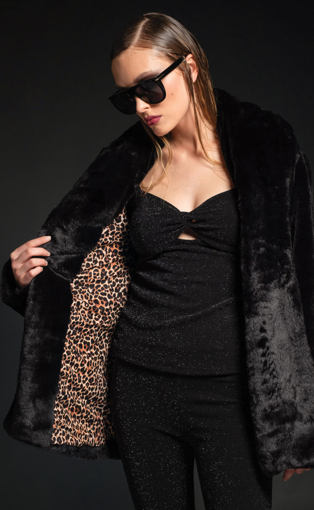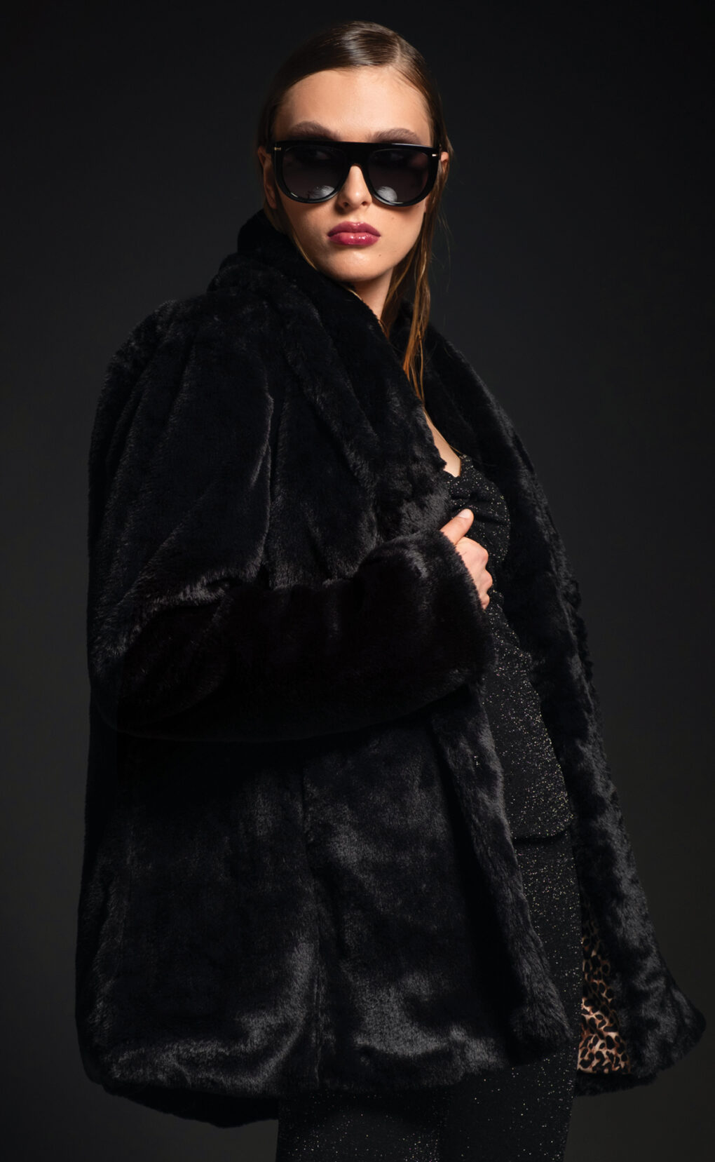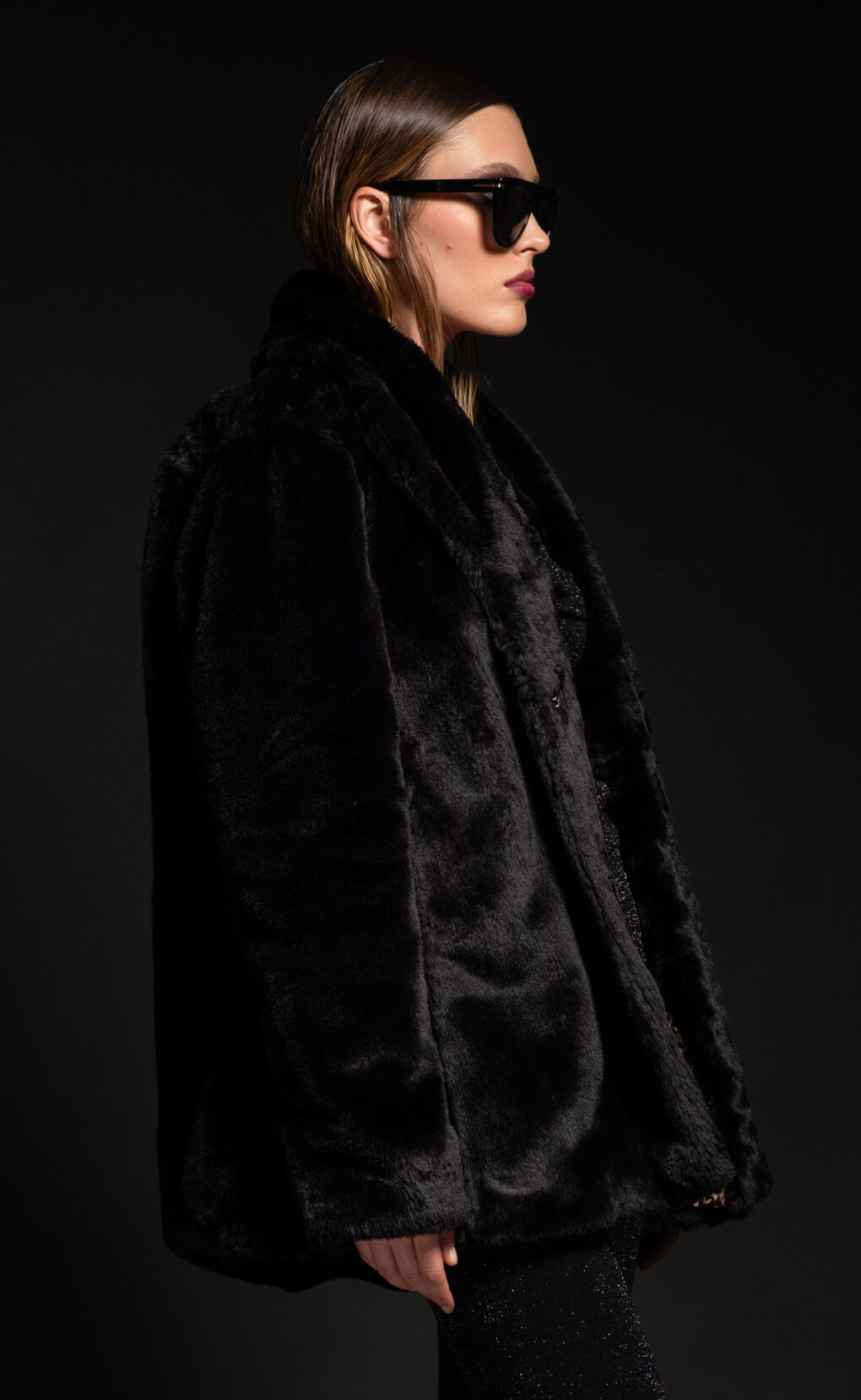 Το Lustrous Eco-Fur Coat είναι μια εντυπωσιακή επιλογή που συνδυάζει πολυτέλεια, ζεστασιά και οικολογική συνείδηση. Με λαμπερό φινίρισμα και απαλή υφή οικολογικής γούνας, αυτό το μαύρο παλτό προσφέρει εκλεπτυσμένο στυλ για κάθε περίσταση.