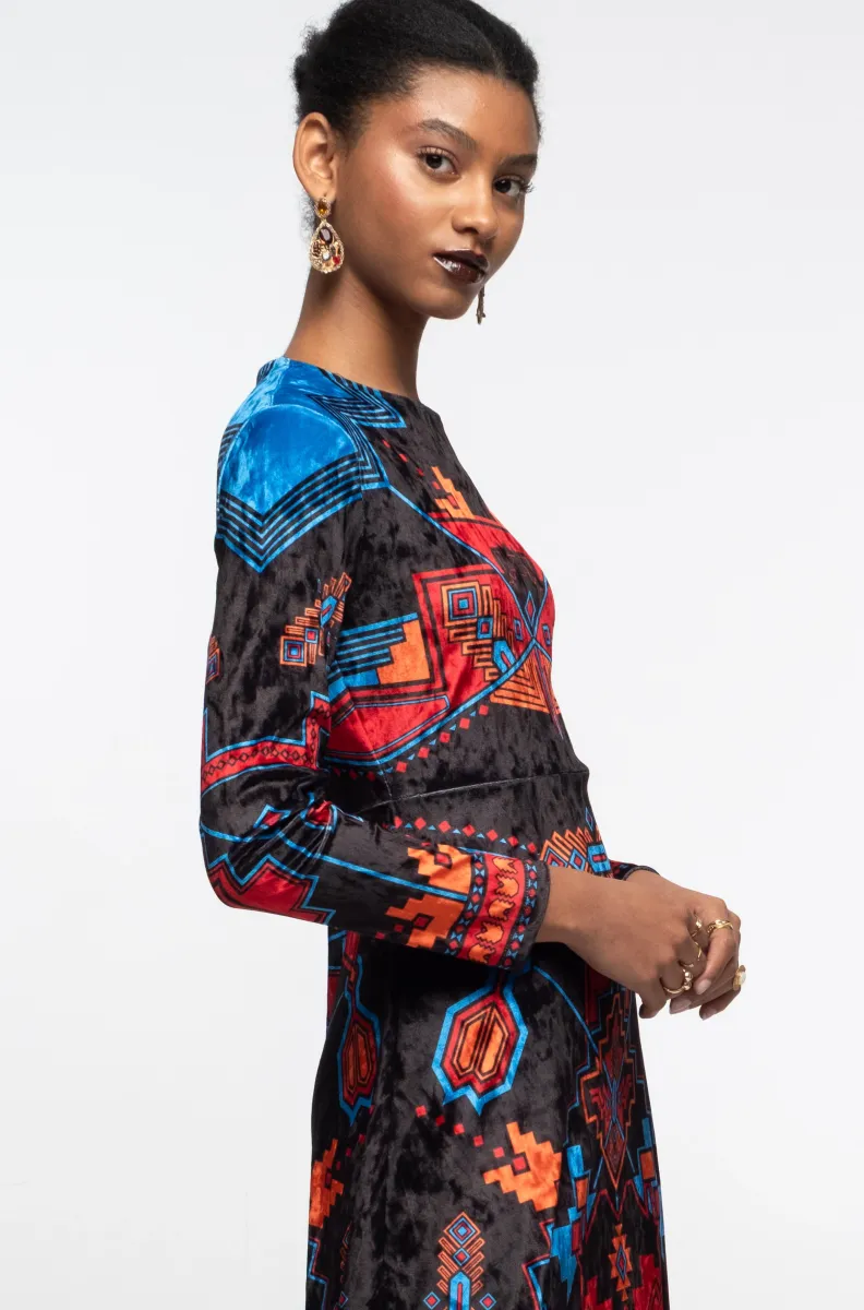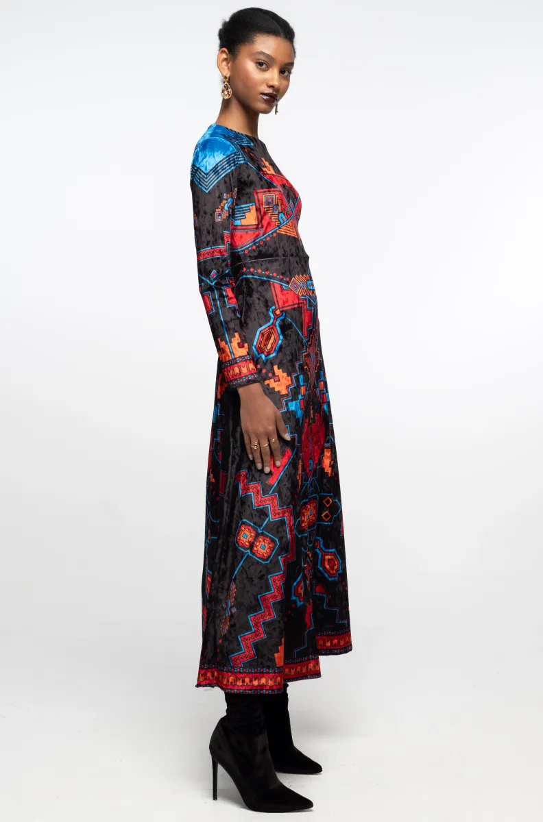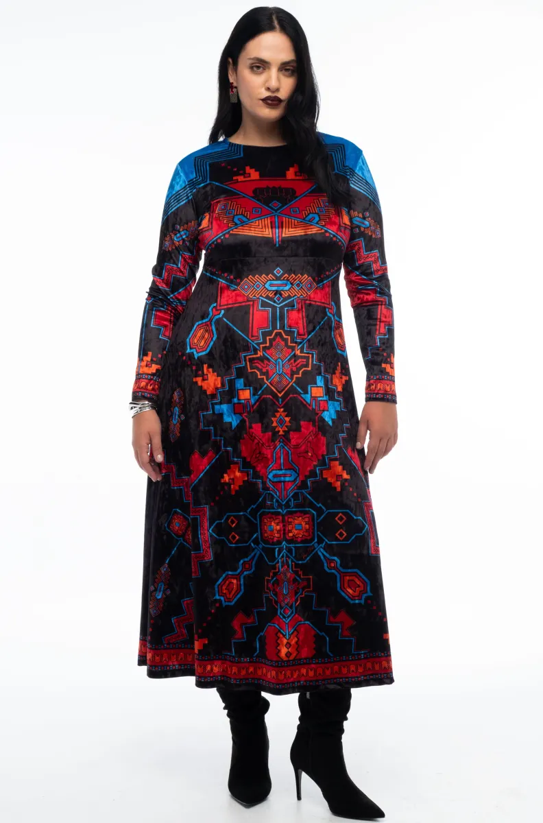 Το Chronicle Long Dress συνδυάζει αρχαία σύμβολα με ψηφιακές επιρροές μέσα από ένα εντυπωσιακό placement print, μοναδικό σε κάθε κομμάτι. Το stretch ice velvet χαρίζει υφή, βάθος χρώματος και άνεση, ενώ η εφαρμογή του αγκαλιάζει τη σιλουέτα και ανοίγει σε μία κλασική A-line γραμμή που κολακεύει κάθε σώμα. Με μακριά μανίκια και κομψή γραμμή, αποτελεί την ιδανική επιλογή για εμφανίσεις που απαιτούν έντονη προσωπικότητα και statement αισθητική.