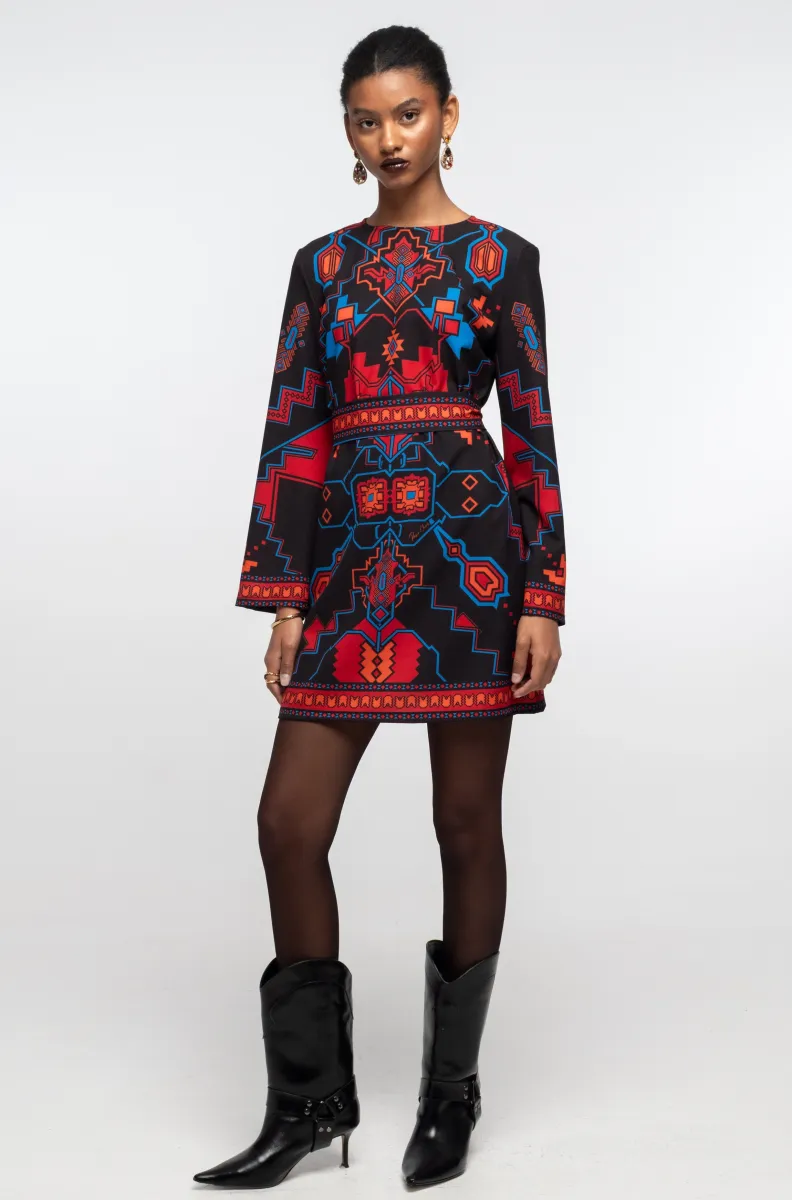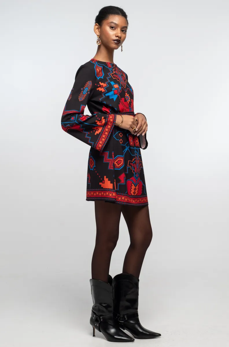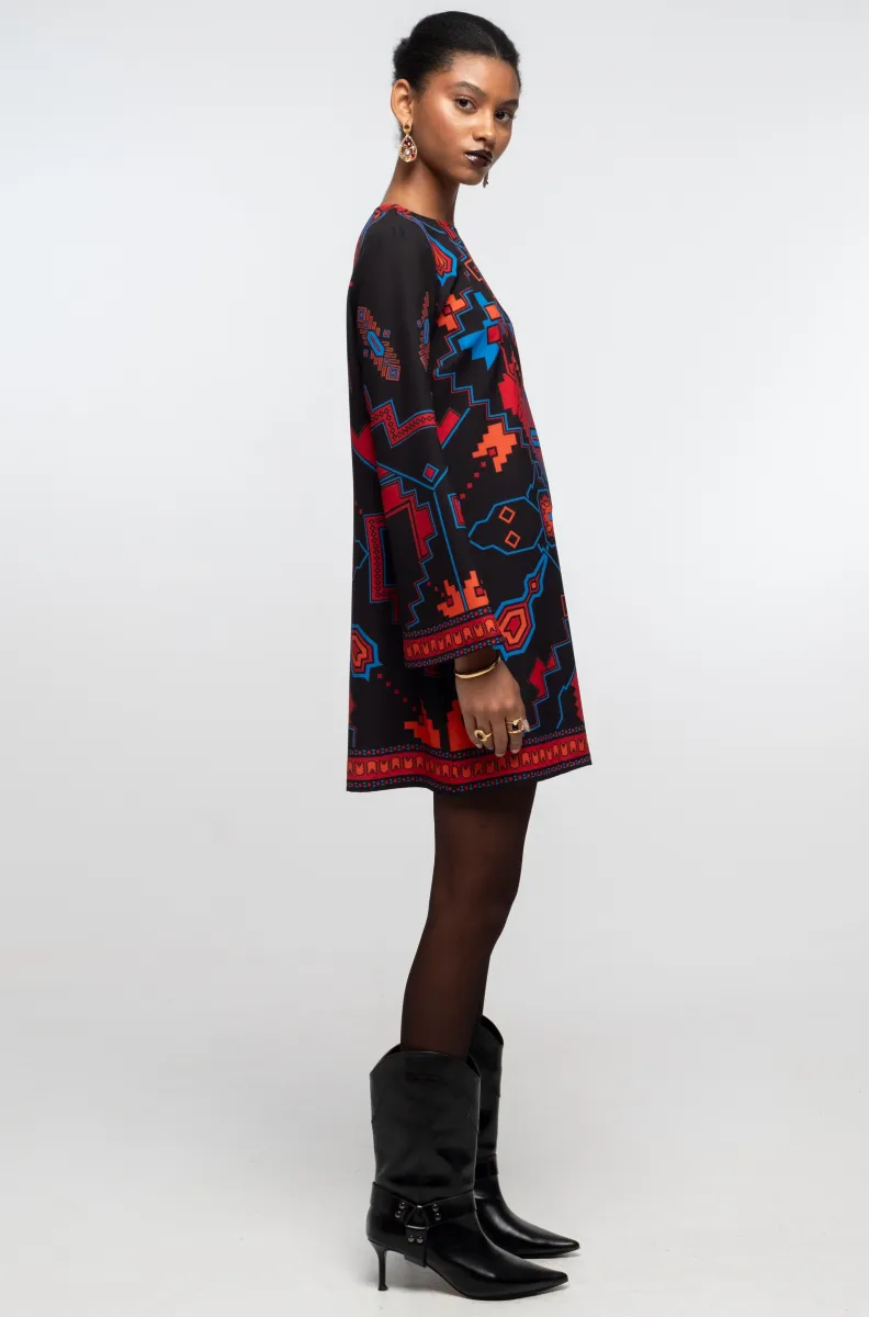 Το Chronicle Short Dress είναι ένα mini φόρεμα με statement χαρακτήρα, διακοσμημένο με placement print που αποτυπώνει ζωντανά χρώματα και συμβολικά μοτίβα πάνω σε crepe ύφασμα. Η Α-line γραμμή του προσφέρει κίνηση και θηλυκότητα, ενώ τα εντυπωσιακά bell sleeves προσθέτουν μια boho αλλά κομψή πινελιά.