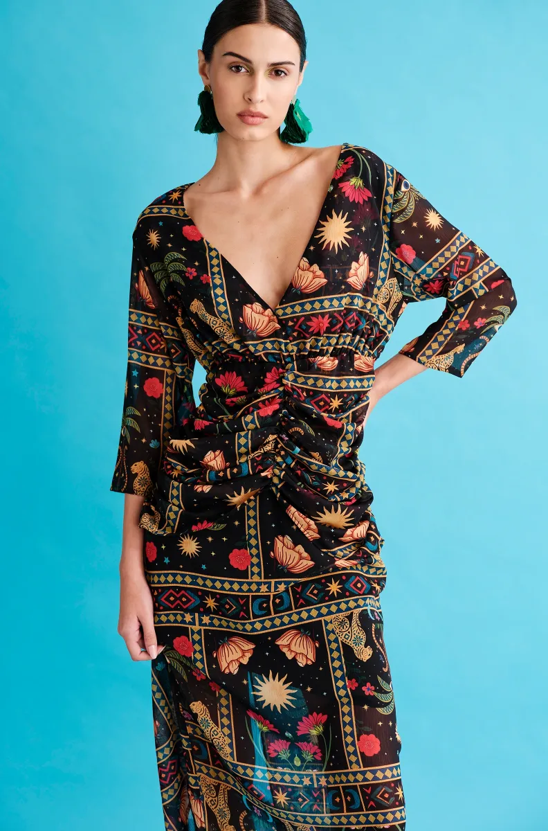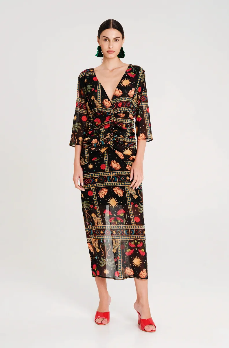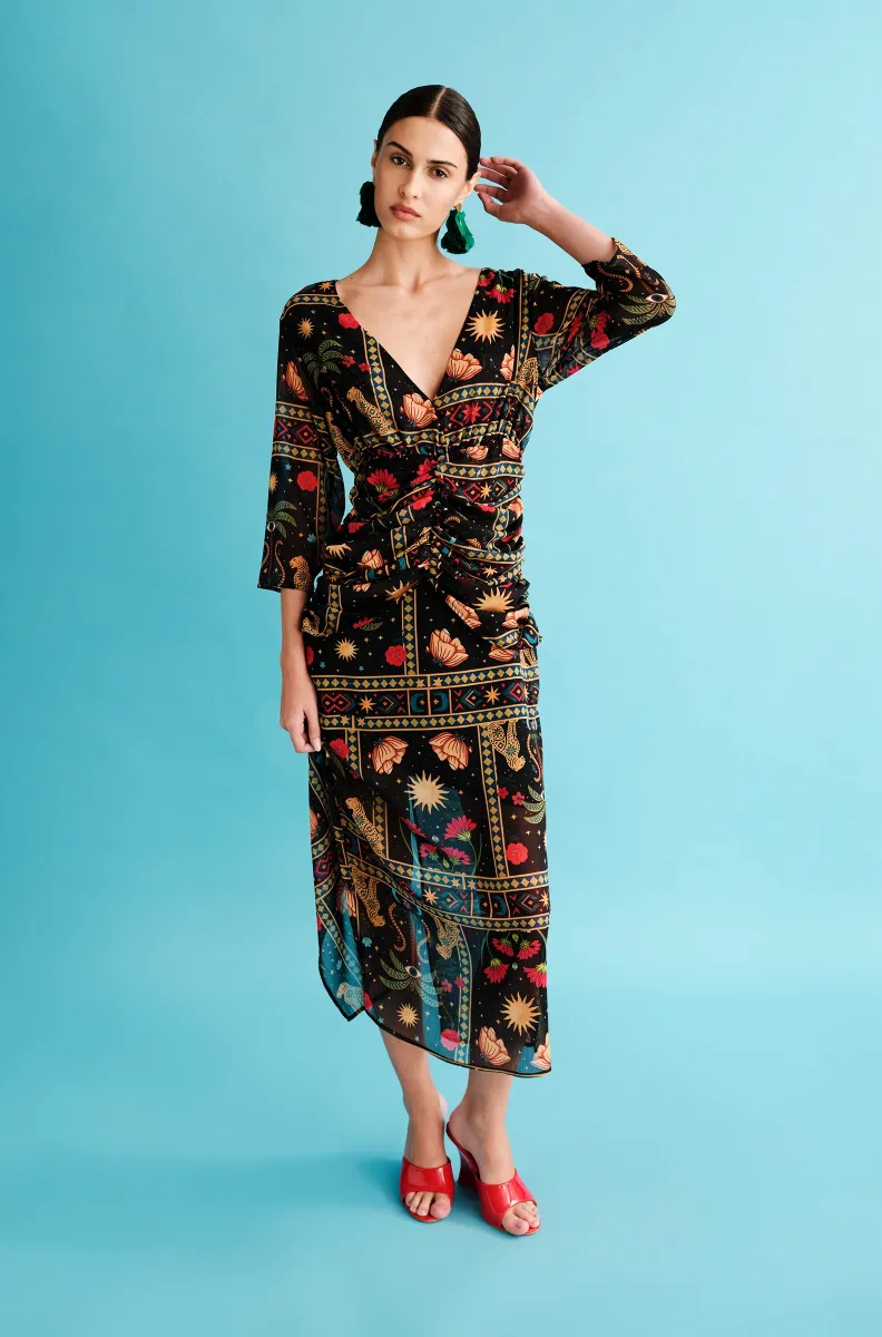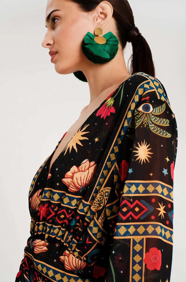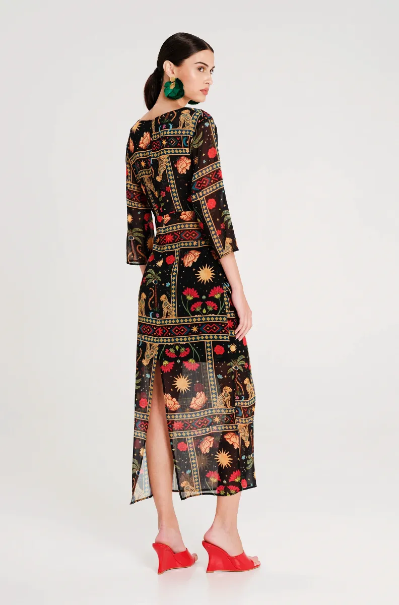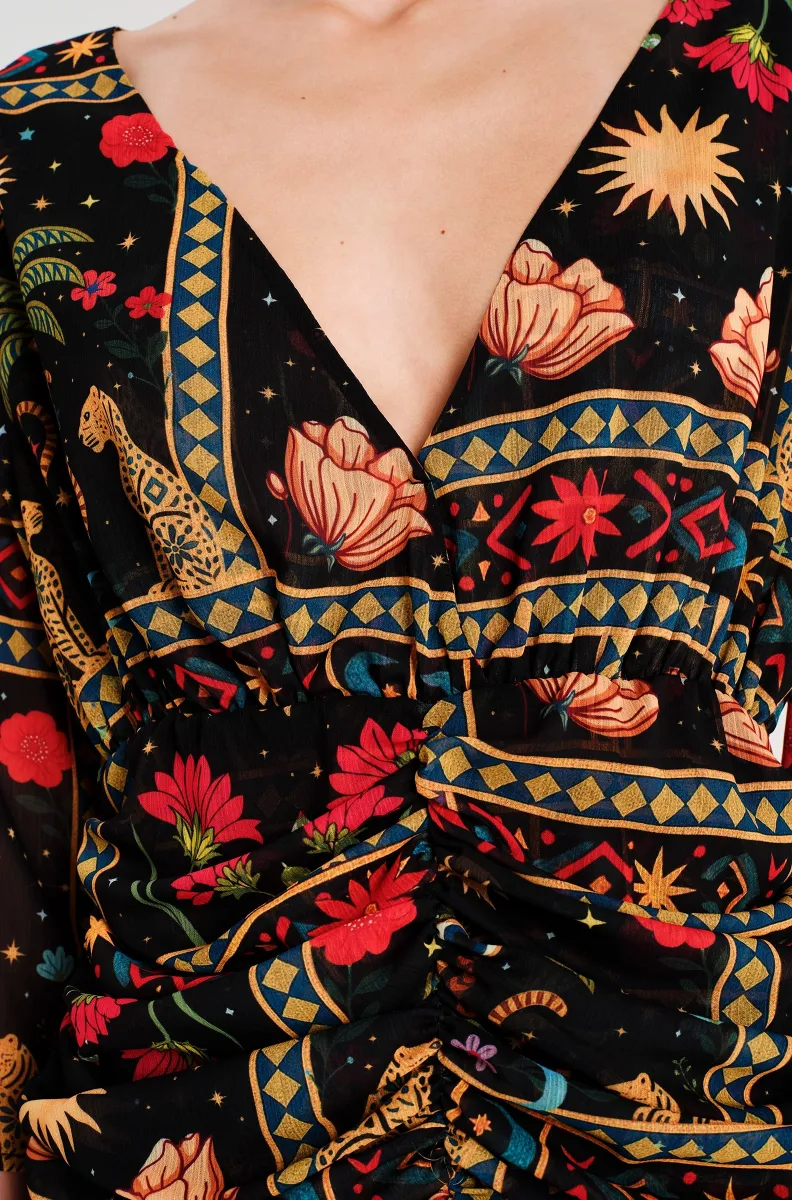 Το Eternity Long Dress διαθέτει θηλυκή σιλουέτα με εμπρόσθια ραφή, λεπτομέρειες σούρας και βαθύ ντεκολτέ με wrap effect. Το all-over print σε διάφανο crepon ύφασμα περιλαμβάνει μυθικά αιλουροειδή, βοτανικά μοτίβα και ουράνια σύμβολα σε βασιλικούς τόνους με χρυσές λεπτομέρειες. Αυτό το εφαρμοστό φόρεμα με ¾ μανίκι ολοκληρώνεται με κρυφό φερμουάρ, πίσω σκίσιμο και λείο ελαστικό slip mini φόρεμα.