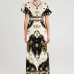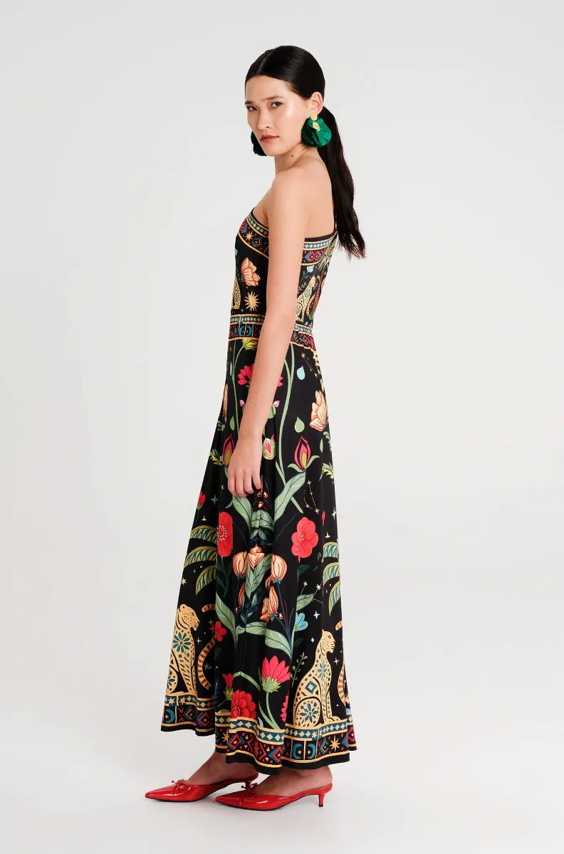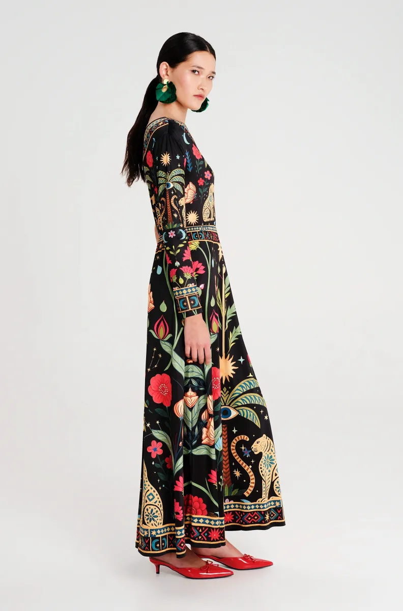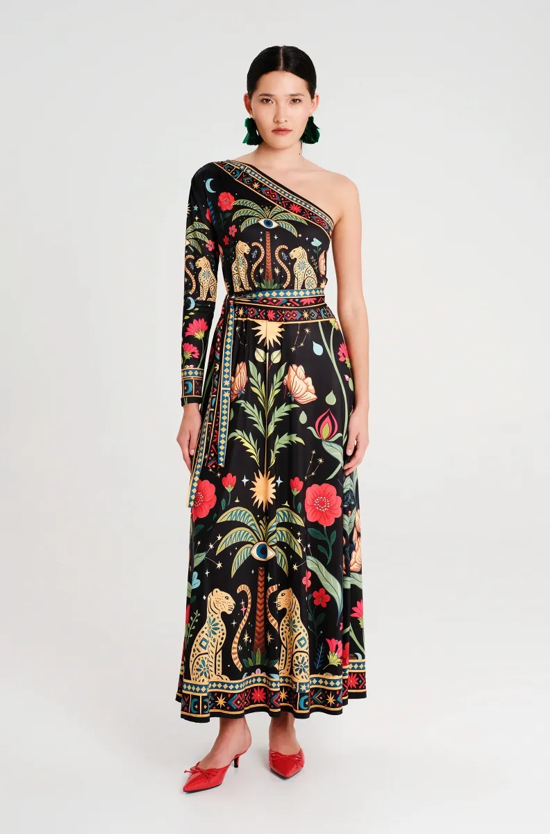 Η κομψότητα και ο δυνατός συμβολισμός ενώνονται στο Eternity One Shoulder Long Dress. Το placement print απεικονίζει προστατευτικά αιλουροειδή, βοτανικά μοτίβα και ουράνια στοιχεία σε χρυσούς και πολύτιμους τόνους. Με ένα μόνο μακρύ μανίκι, αυτό το φόρεμα από απαλό ελαστικό jersey ανοίγει σε γραμμή Α από την ελαστική μέση. Για ακόμα πιο καθορισμένη σιλουέτα, φορέστε το με την ασορτί ζώνη του.