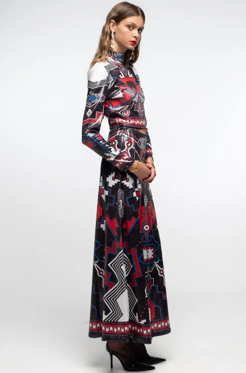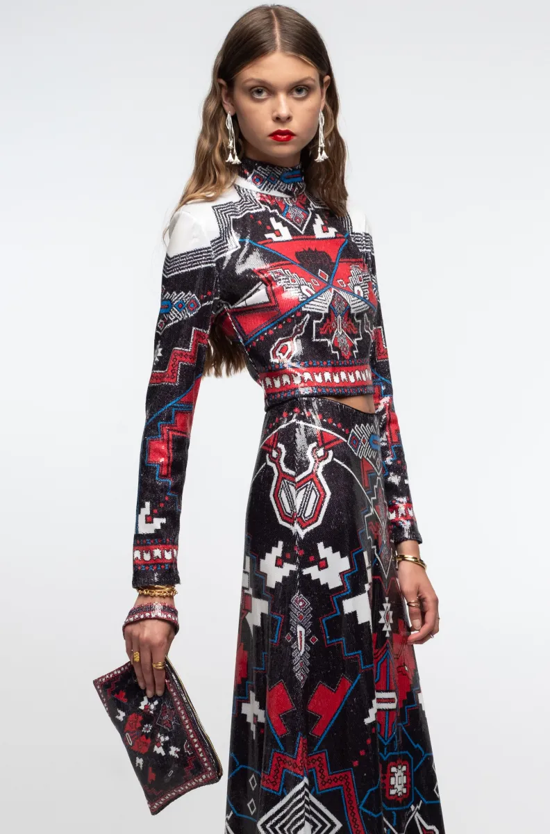 Το Legacy Turtleneck Top είναι ένα εντυπωσιακό βραδινό κομμάτι που συνδυάζει πολυτέλεια και καλλιτεχνική αισθητική. Η placement print τεχνική αποδίδει μοναδικά μοτίβα εμπνευσμένα από φολκλορικές και ψηφιακές αναφορές, ενώ η επικάλυψη με παγιέτες χαρίζει λάμψη και βάθος.