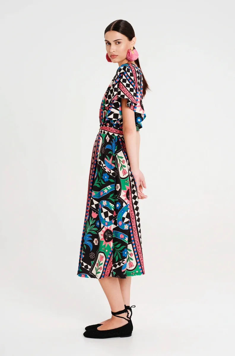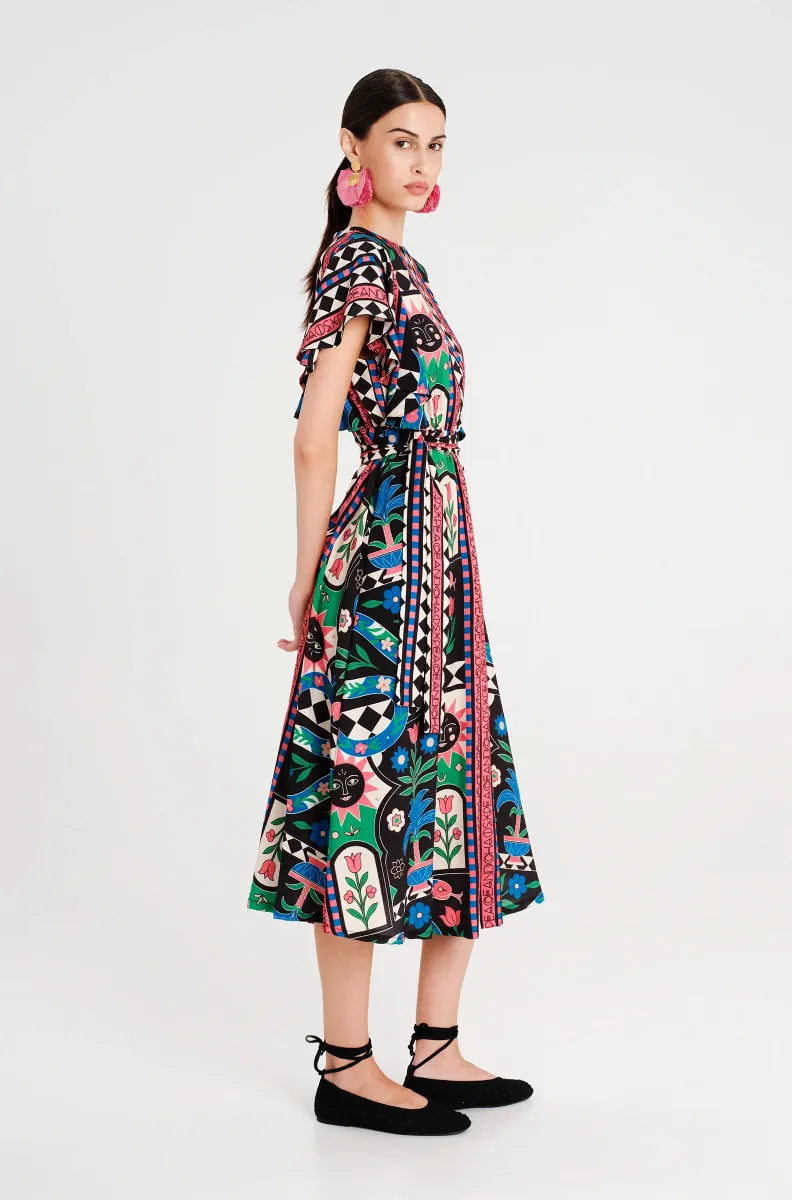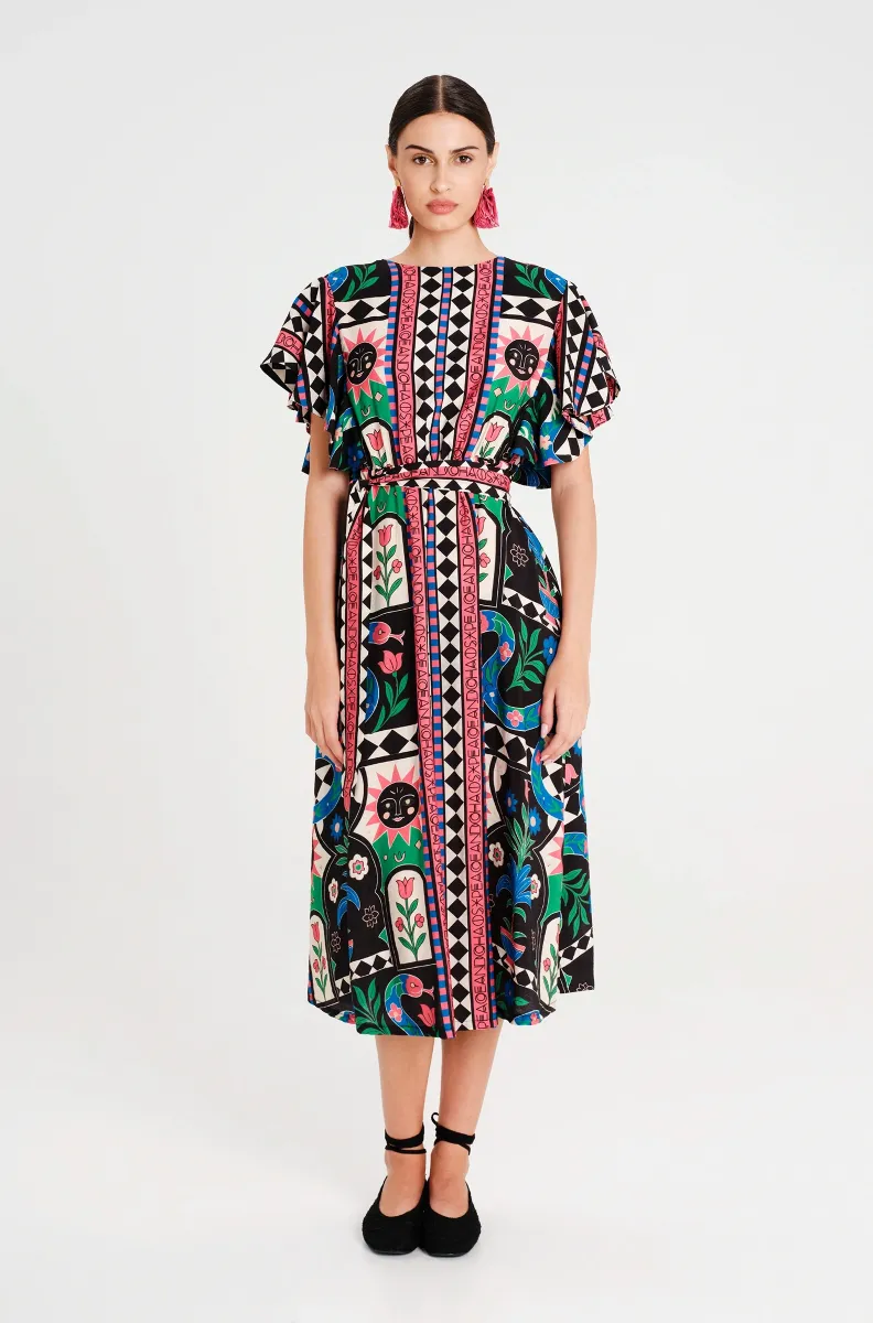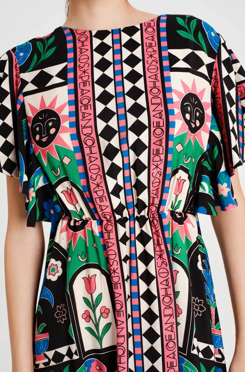 Το Manifestation Long Dress διαθέτει placement print σε folk art στυλ, με μοτίβα από τον Κήπο της Εδέμ και μυθικά πλάσματα. Τα καμπάνα μανίκια προσθέτουν παιχνιδιάρικη διάθεση σε αυτό το μακρύ φόρεμα από μαλακό rayon, ενώ το κρυφό φερμουάρ στο πίσω μέρος, η ελαστική μέση και η ασορτί ζώνη προσδίδουν ορισμό στη σιλουέτα. Ιδανικό για γεύματα και εξόδους, αυτό το χαριτωμένο φόρεμα ημέρας συνδυάζει στυλ και άνεση.