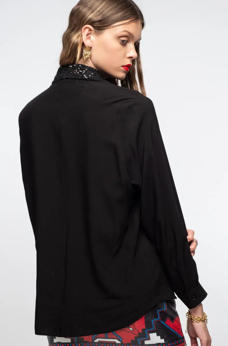 Το Mineral Shirt είναι η απόλυτη επιλογή για όσες θέλουν μια διαχρονική μπλούζα με διακριτή λάμψη. Κατασκευασμένη από απαλό, ρευστό ύφασμα, διαθέτει γιακά διακοσμημένο με παγιέτες, προσδίδοντας μια κομψή, αστραφτερή πινελιά που αναβαθμίζει εύκολα κάθε εμφάνιση. Η κρυφή πατιλέτα και η μεταλλική λεπτομέρεια Chaka υπογραμμίζουν τη μίνιμαλ αλλά εκλεπτυσμένη αισθητική του σχεδίου.