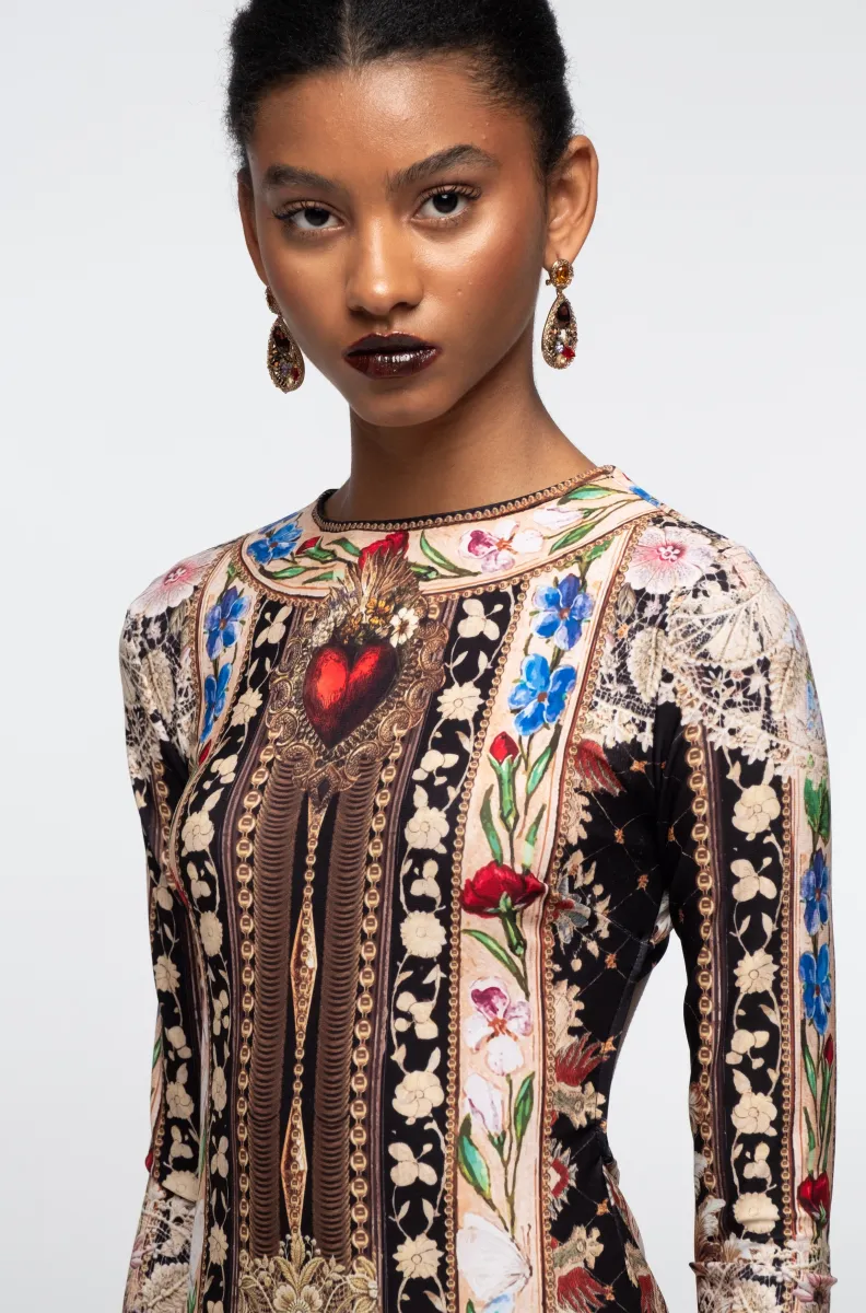Το Opulence Dress είναι ένα εντυπωσιακό, μακρύ φόρεμα που συνδυάζει τη ρομαντική πολυτέλεια με τη δυναμική αισθητική της Peace + Chaos. Τοποθετημένα μοτίβα (placement print) με δαντέλες, πέρλες, λουλούδια σε jewel τόνους και φλογερά σύμβολα δημιουργούν ένα εντυπωσιακό, σχεδόν εικαστικό αποτέλεσμα που ξεχωρίζει με την πρώτη ματιά.