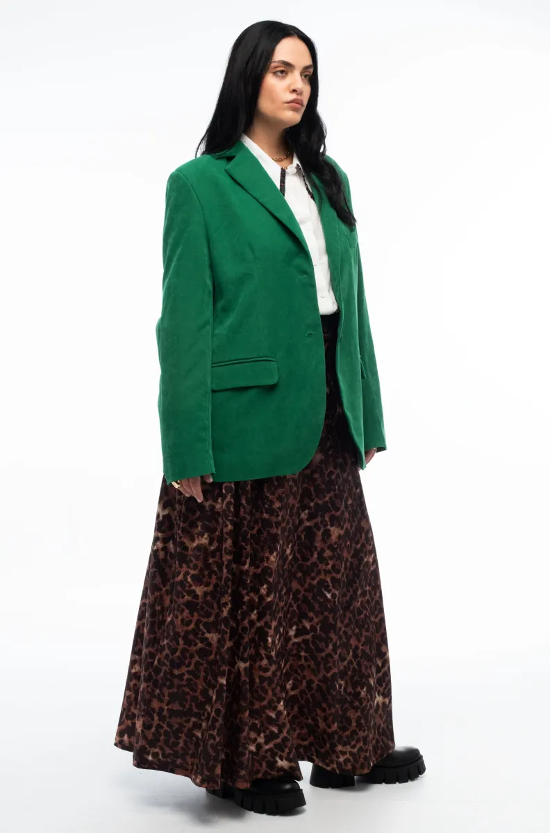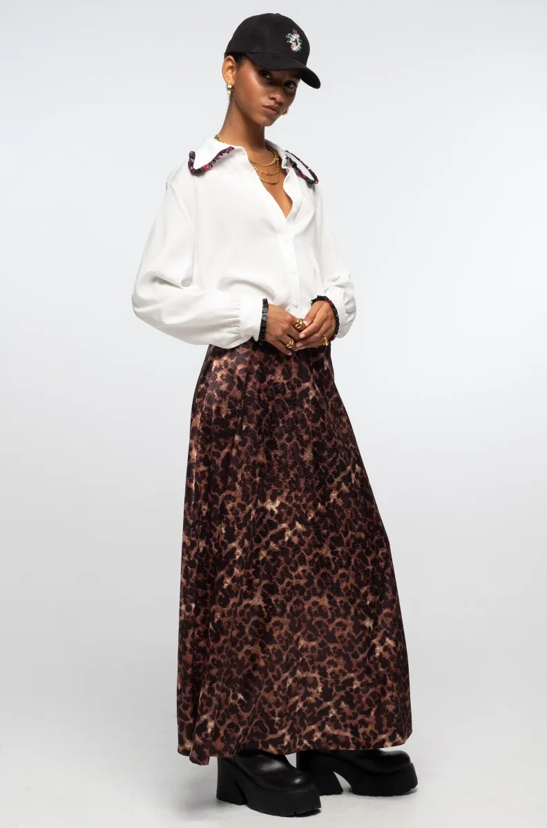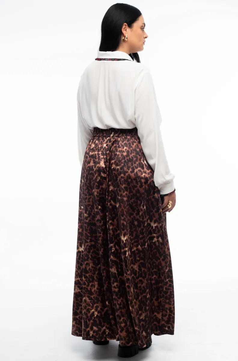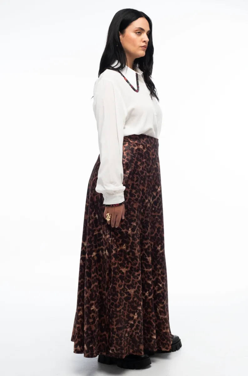 Η Rosette Long Skirt ξεχωρίζει με το ιδιαίτερο all-over print της, που θυμίζει rose-leopard μοτίβο πάνω σε python satin jacquard ύφασμα, δημιουργώντας ένα διαχρονικό αλλά και statement αποτέλεσμα. Η γραμμή της είναι μακριά Α-line, προσφέροντας κομψή κίνηση και άνετη εφαρμογή, ενώ η ψηλόμεση εφαρμογή κολακεύει τη μέση και “μακραίνει” οπτικά τη σιλουέτα.