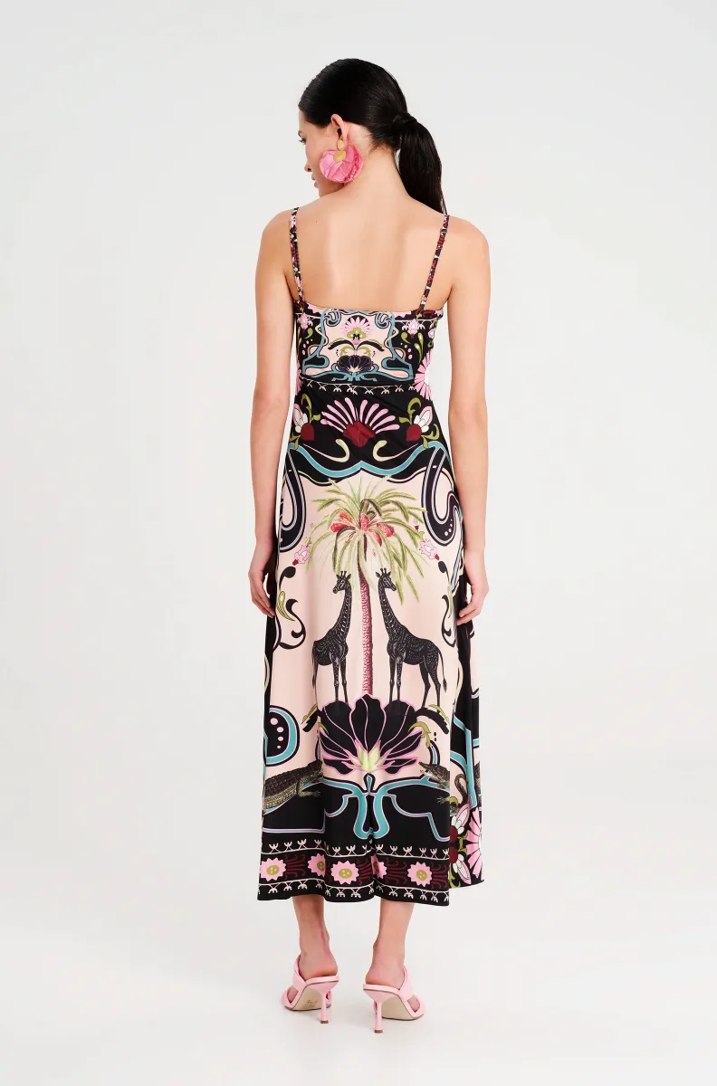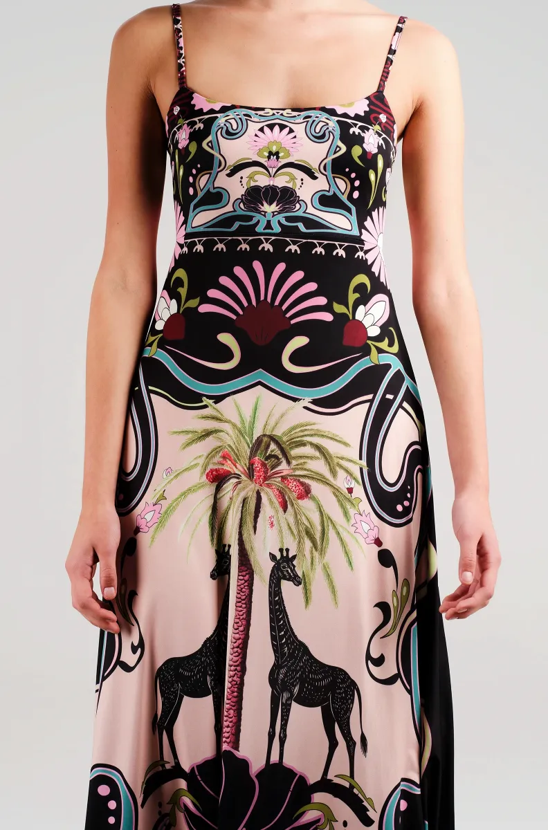 Το Sanctuary Dress απεικονίζει γαλήνιες καμηλοπαρδάλεις που ξεκουράζονται κάτω από έναν φοίνικα, συμβολίζοντας την ομορφιά και τη χάρη. Οργανικές γραμμές, βοτανικά μοτίβα και ιερά πλάσματα συνθέτουν το placement print. Αυτό το μακρύ φόρεμα διαθέτει κολακευτική γραμμή Α, άνετο απαλό ελαστικό jersey ύφασμα και ρυθμιζόμενες λεπτές τιράντες για εξατομικευμένη εφαρμογή.