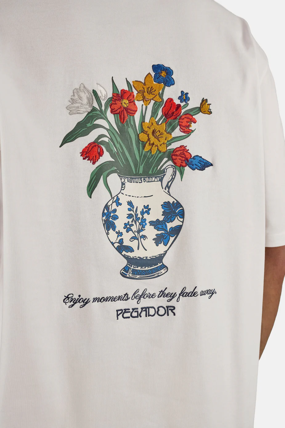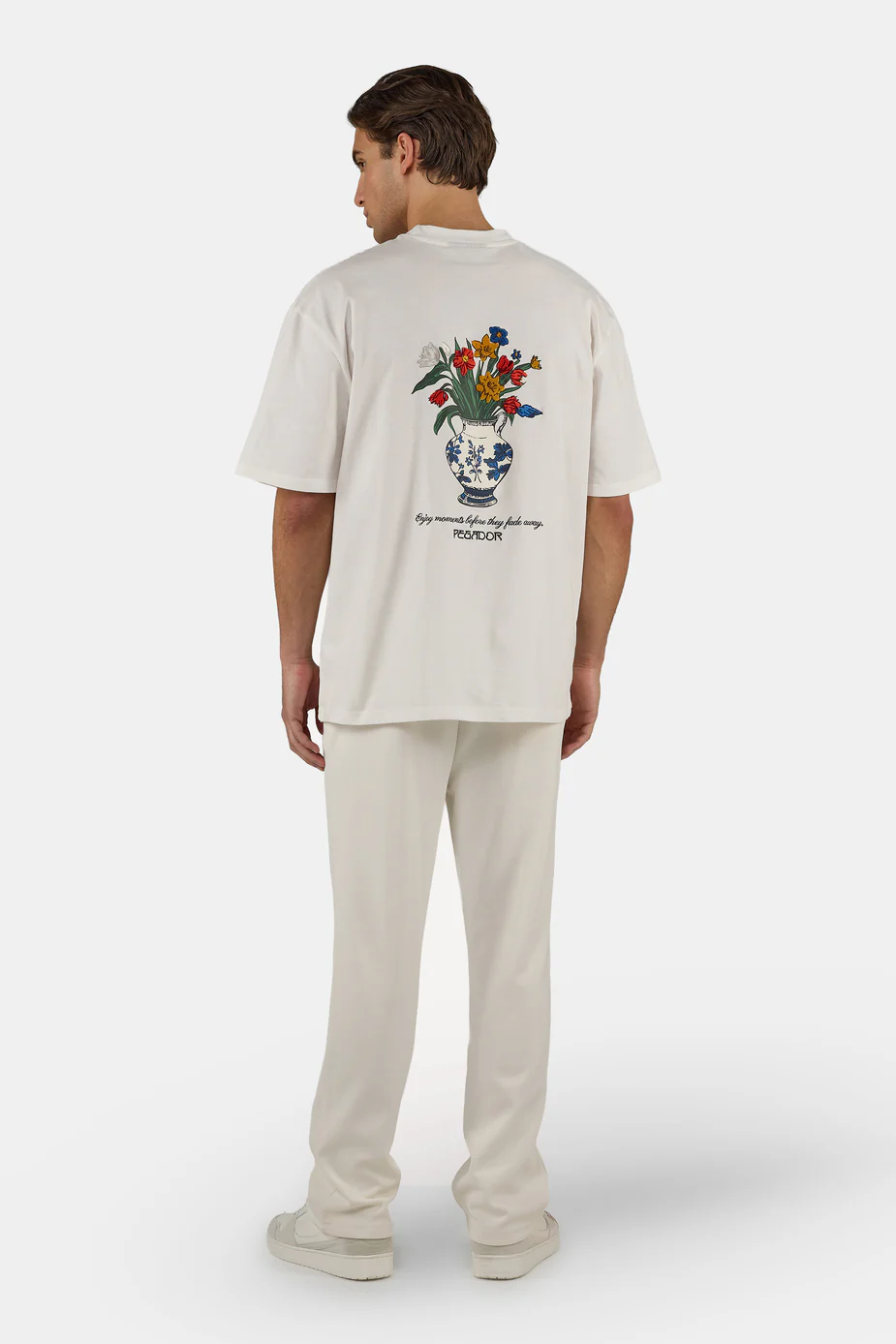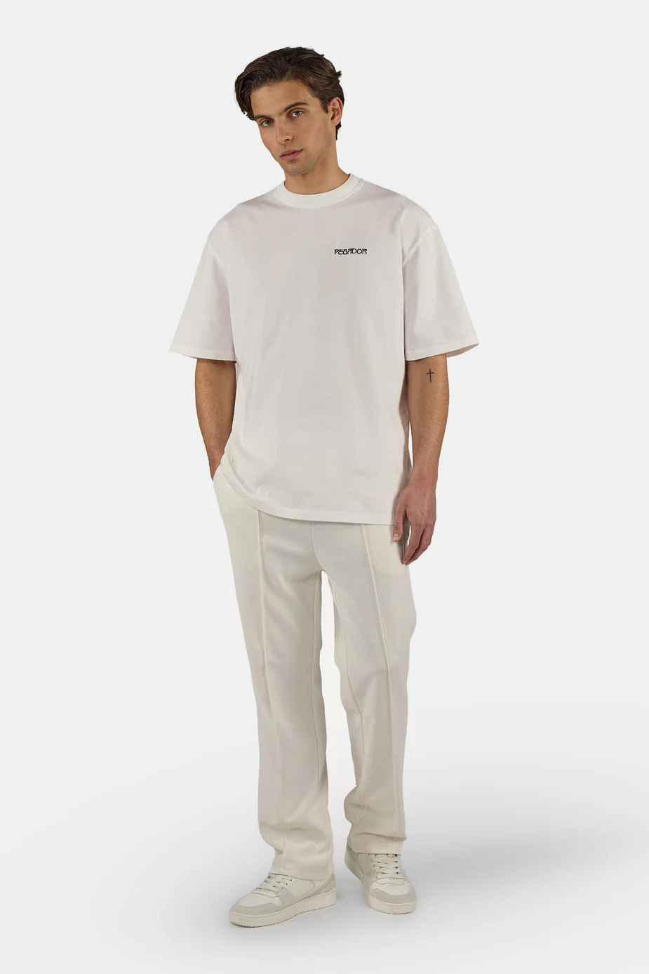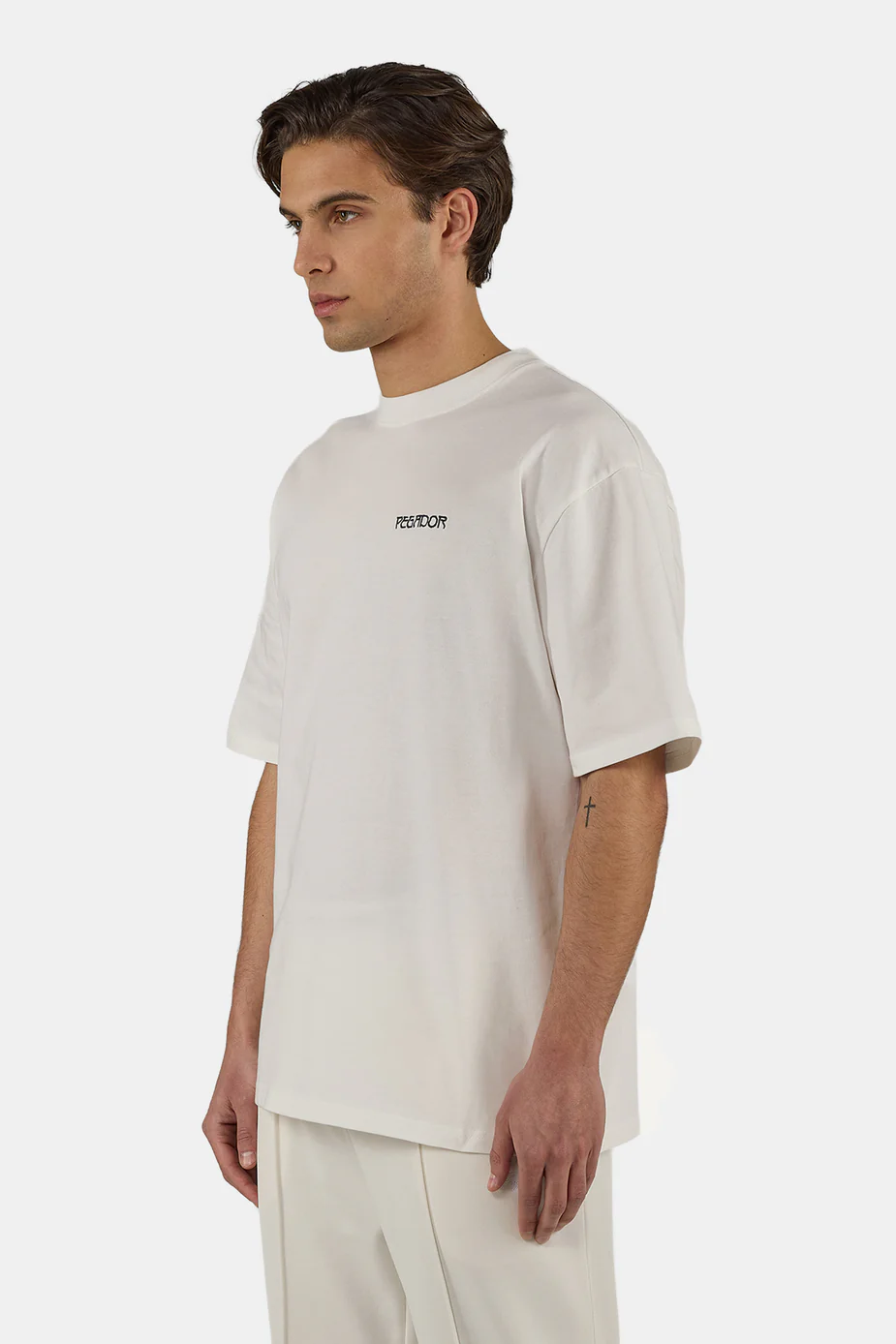 Ανανεώστε το casual στυλ σας με αυτό το warm white oversized T-shirt. Οι ελαφρώς κεκλιμένοι ώμοι προσφέρουν άνετη εφαρμογή, ενώ το κέντημα λογότυπου μπροστά και οι εκτυπώσεις κειμένου & γραφικού στο πίσω μέρος προσδίδουν μοναδικό χαρακτήρα.