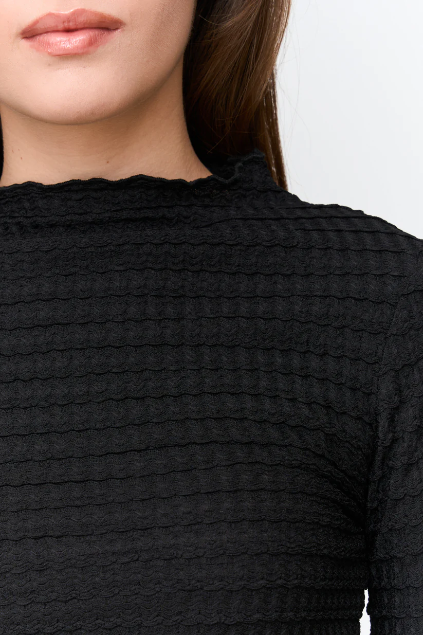 Το Womens Long Sleeve Top Black συνδυάζει καθαρές γραμμές και διακριτική υφή για ένα κομψό, σύγχρονο αποτέλεσμα.